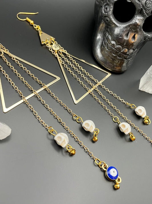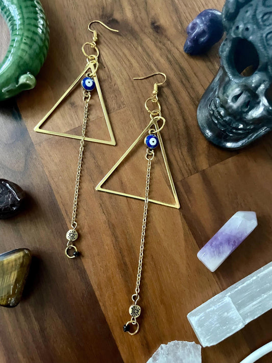 Evil eye & Gold Triangle Dangly Statement Earrings | Halloween gifts | Nickel Free Hypoallergic ear wires | new and upcycled beads