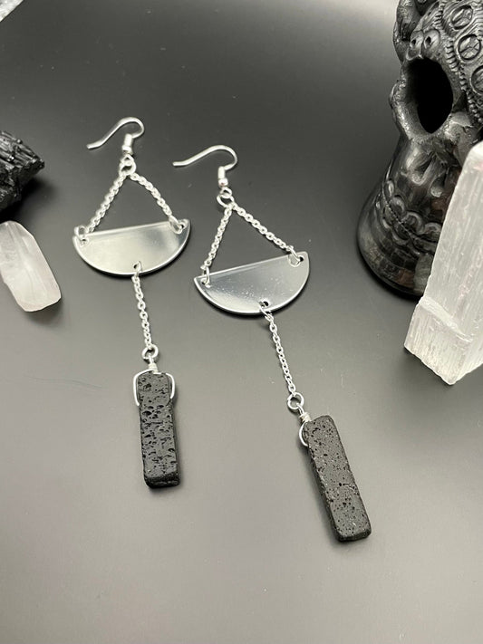 Black lava rock silver semi-circle dangle earrings | Witchy earrings | Boho earrings | Nickel Free Hypoallergic plated steel ear wires