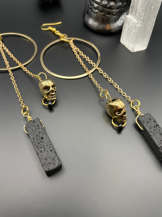 Black lava rock and golden skull statement earrings | Witchy earrings | Boho earrings | Nickel Free Hypoallergic plated steel ear wires