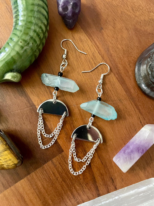 Aqua Quartz Crystal Silver Tone Half Moon Dangly Statement Earrings | Halloween gifts | Nickel Free Hypoallergic ear wires