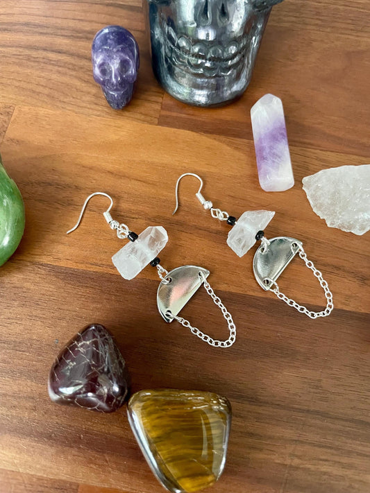 Clear quartz crystal silver half moon dangle statement earrings | Witchy boho earrings | Nickel Free Hypoallergic plated steel ear wires