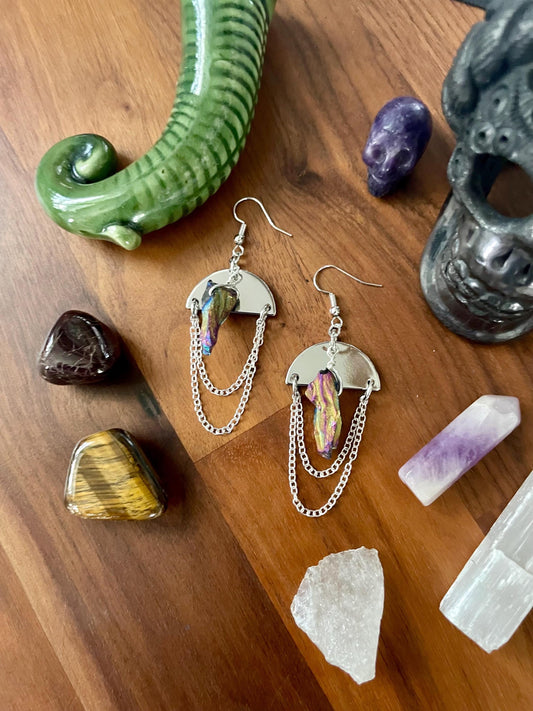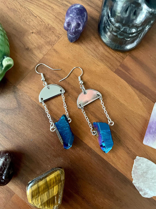 Sapphire Luster Quartz silver semi-circle dangle statement earrings | Nickel Free Hypoallergic plated steel ear wires | Witchy Boho Earrings