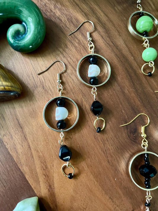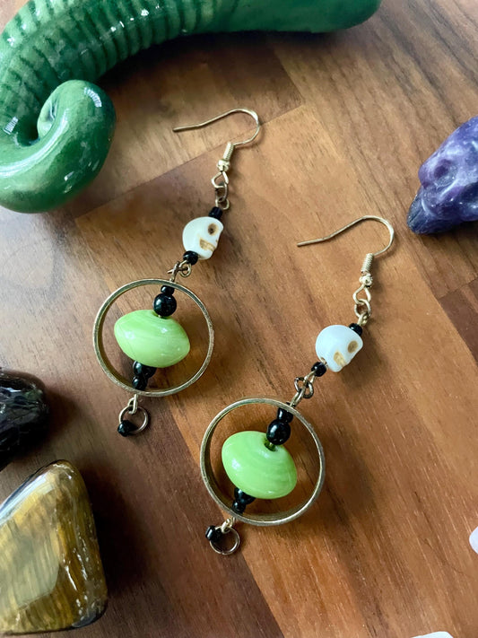 Black, Gold, and Green Skull Dangly Statement Earrings | Halloween gifts | Nickel Free Hypoallergic ear wires | new and upcycled beads