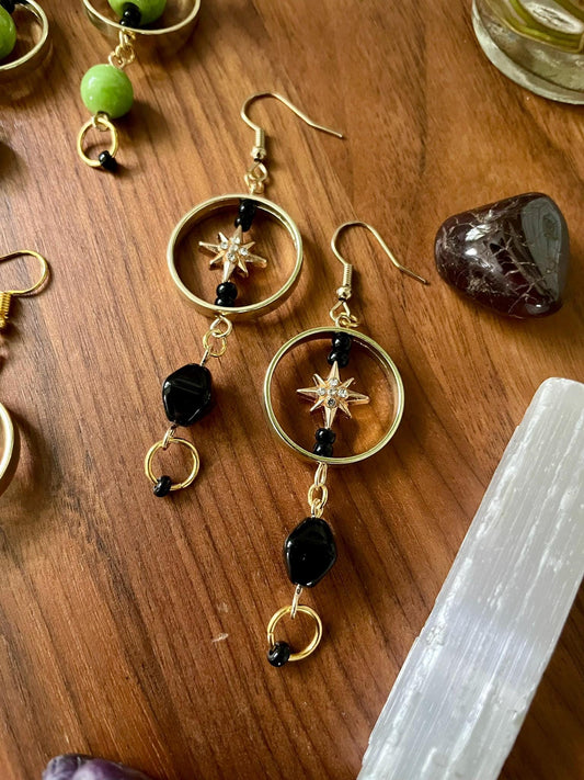 Black & Gold Celestial Star Dangly Statement Earrings | Halloween gifts | Nickel Free Hypoallergic ear wires | new and upcycled beads