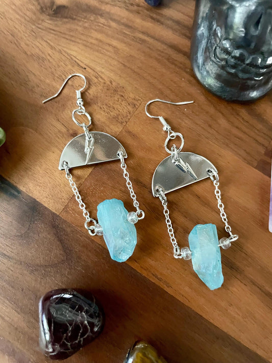 Aqua quartz, lightening charm, silver semi-circle dangle statement earrings | witchy boho earrings | Nickel Free Hypoallergic ear wires