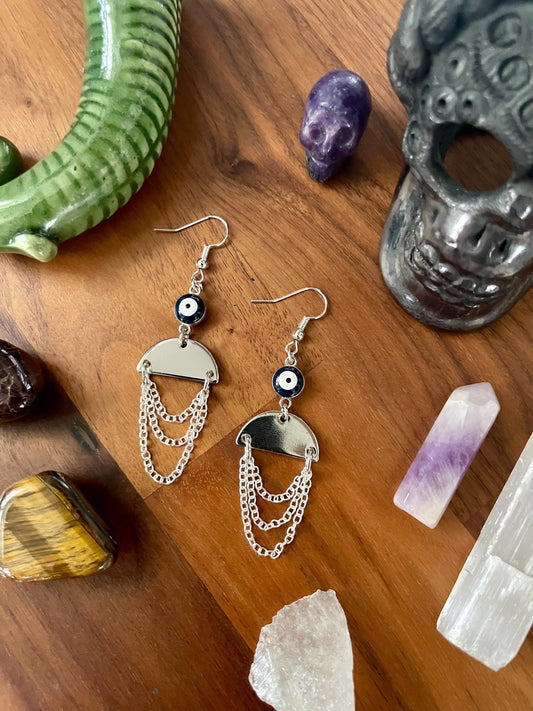 Evil eye silver semi-circle dangle earrings | Witchy Boho dangly drop Statement Earrings | Nickel Free Hypoallergic plated steel ear wires