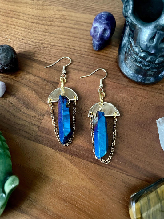 Sapphire Luster Quartz gold semi-circle dangle statement earrings | Nickel Free Hypoallergic plated steel ear wires | Witchy Boho Earrings