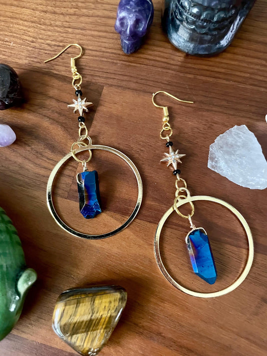 Celestial Sapphire Luster Quartz twinkle star gold dangle statement earrings | Nickel Free Hypoallergic ear wires | Witchy Boho Earrings