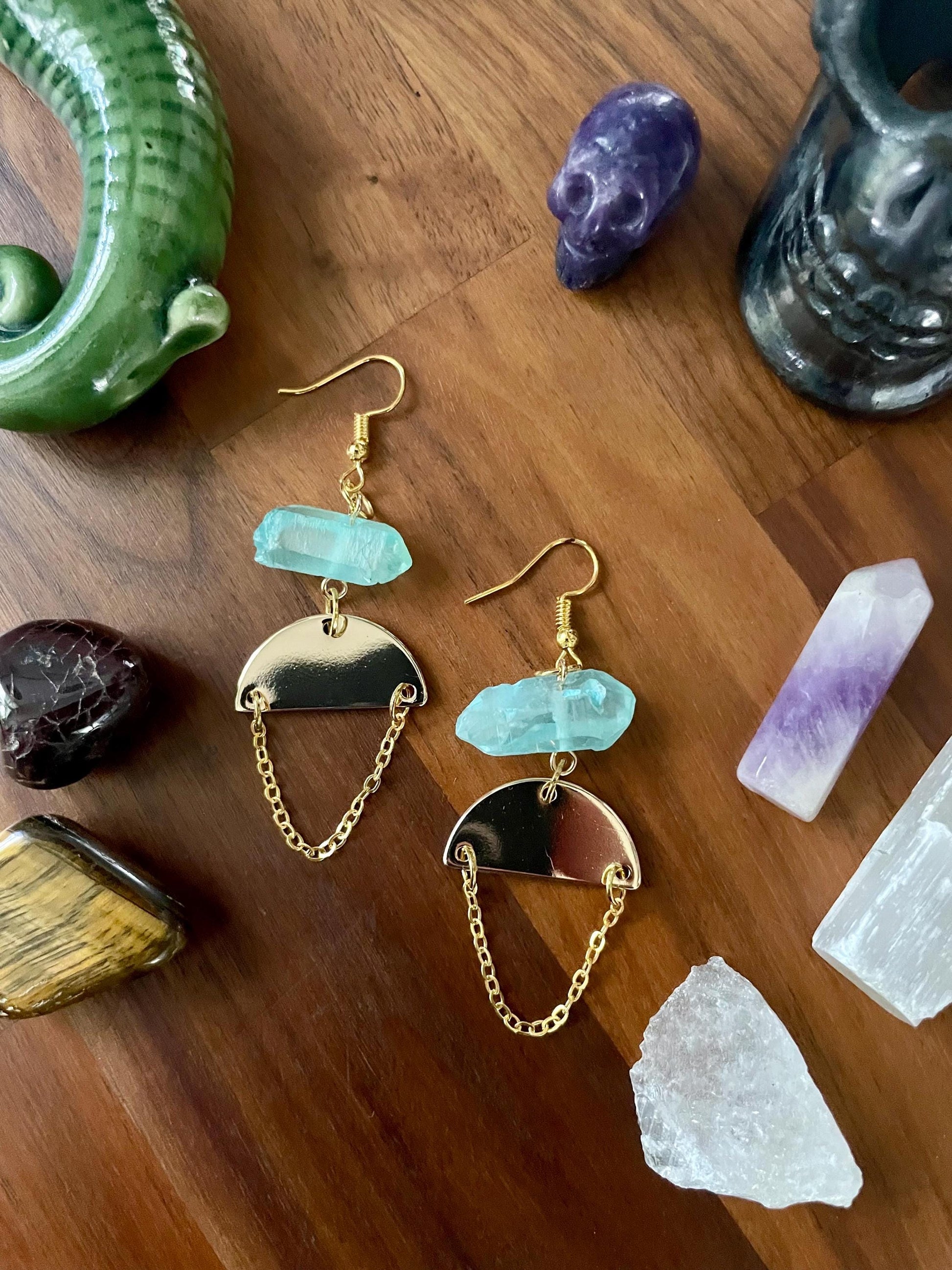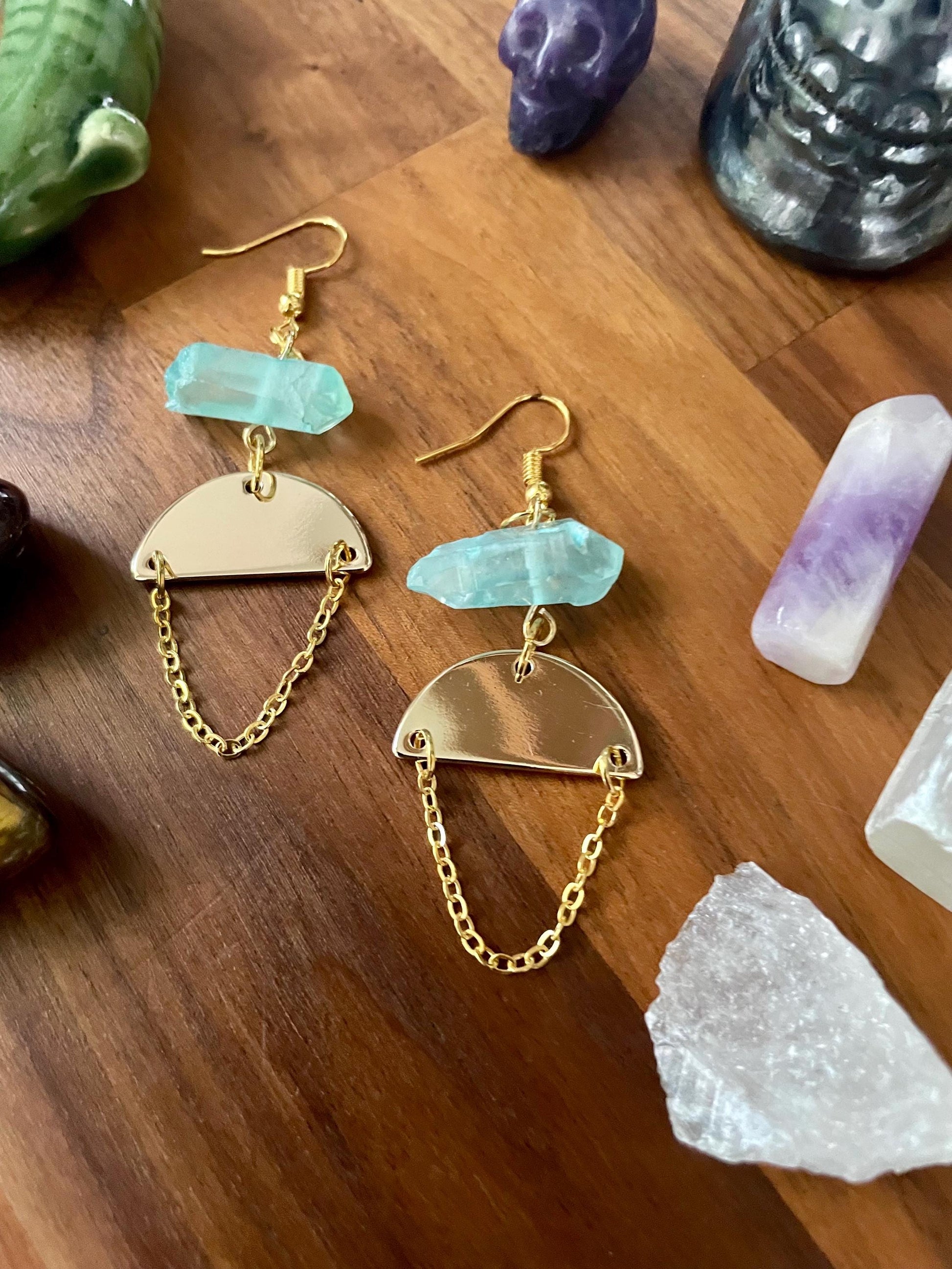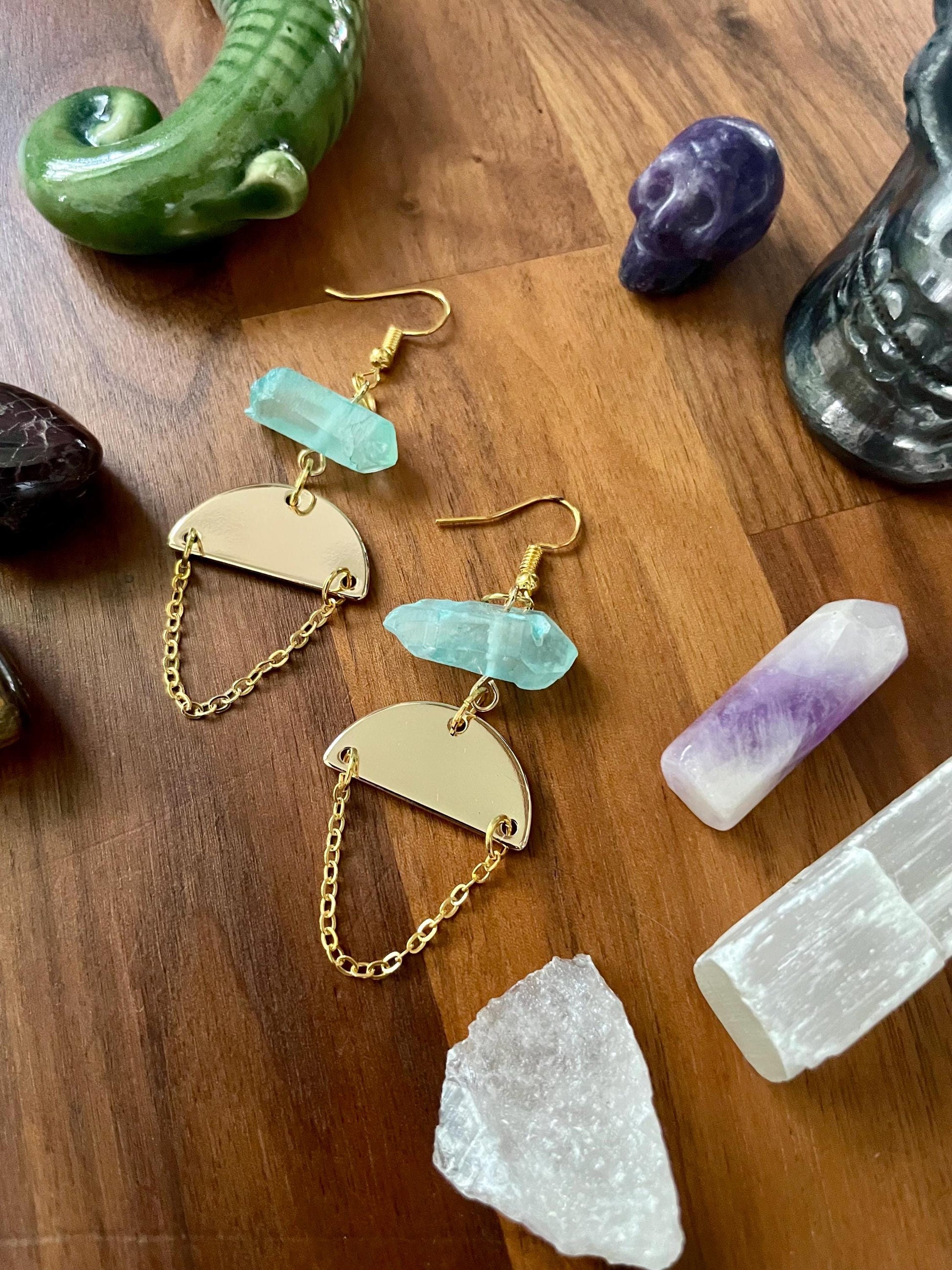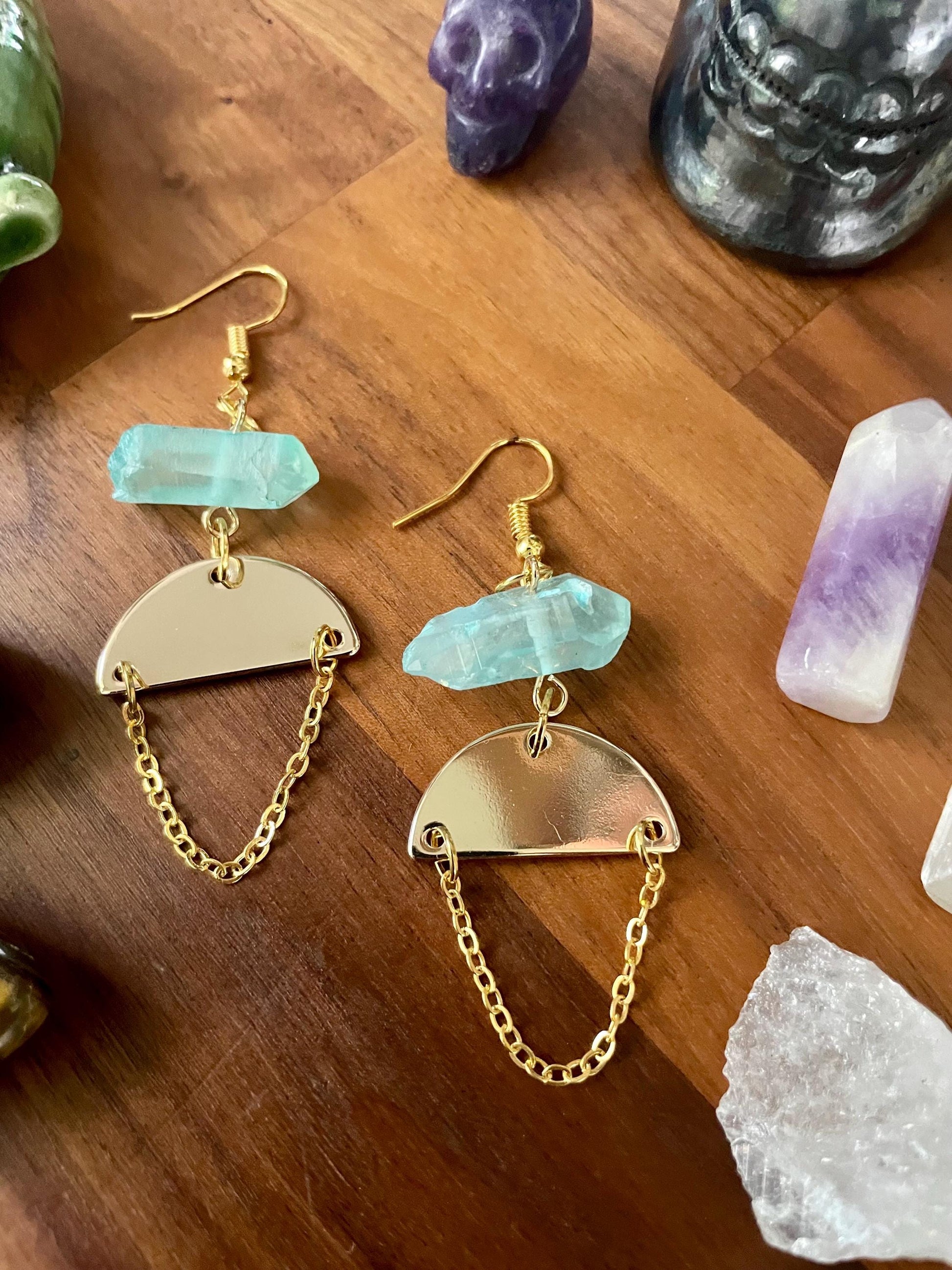 Aqua Quartz Crystal Gold Tone Half Moon Dangly Statement Earrings | Halloween gifts | Nickel Free Hypoallergic ear wires