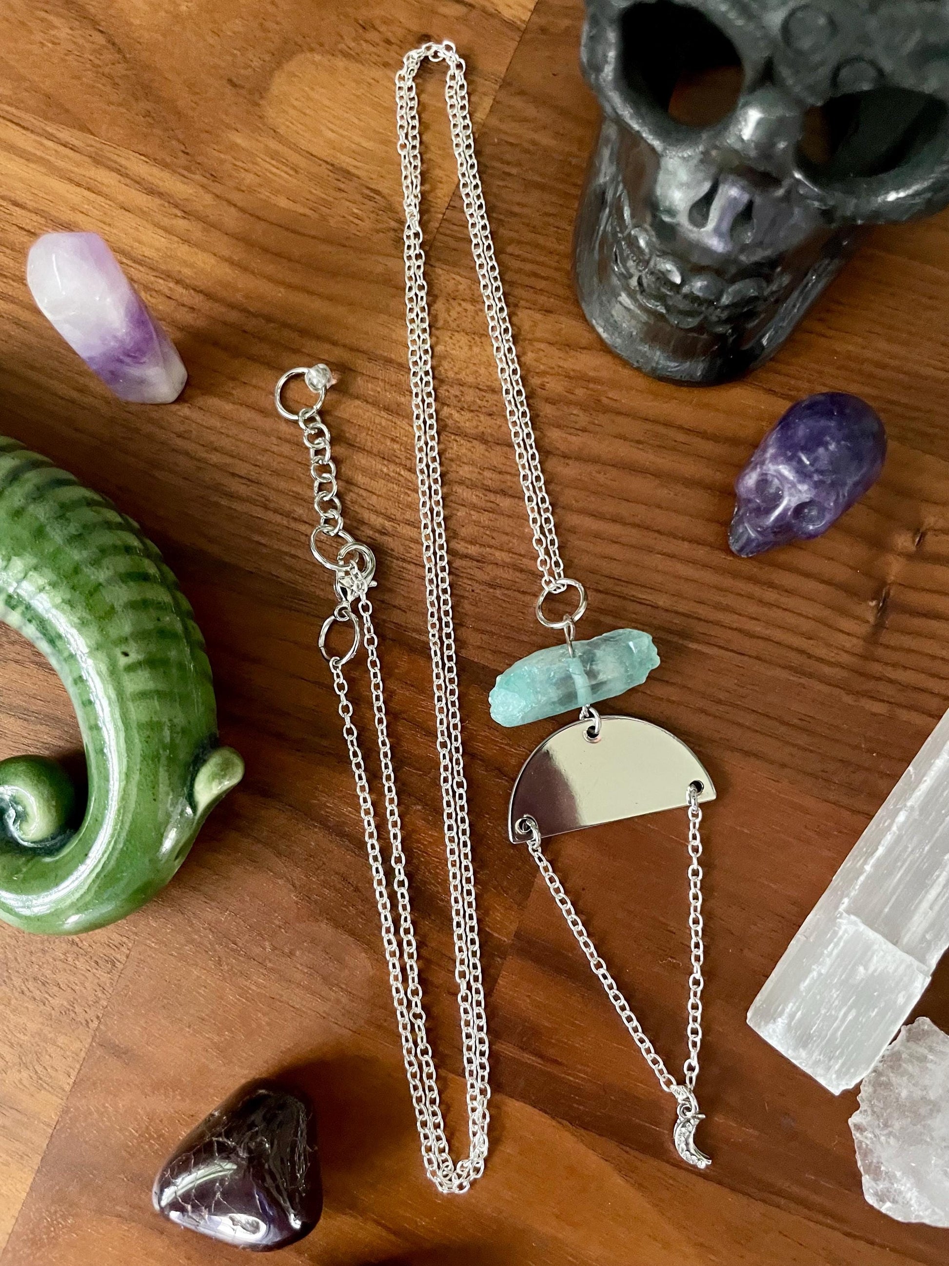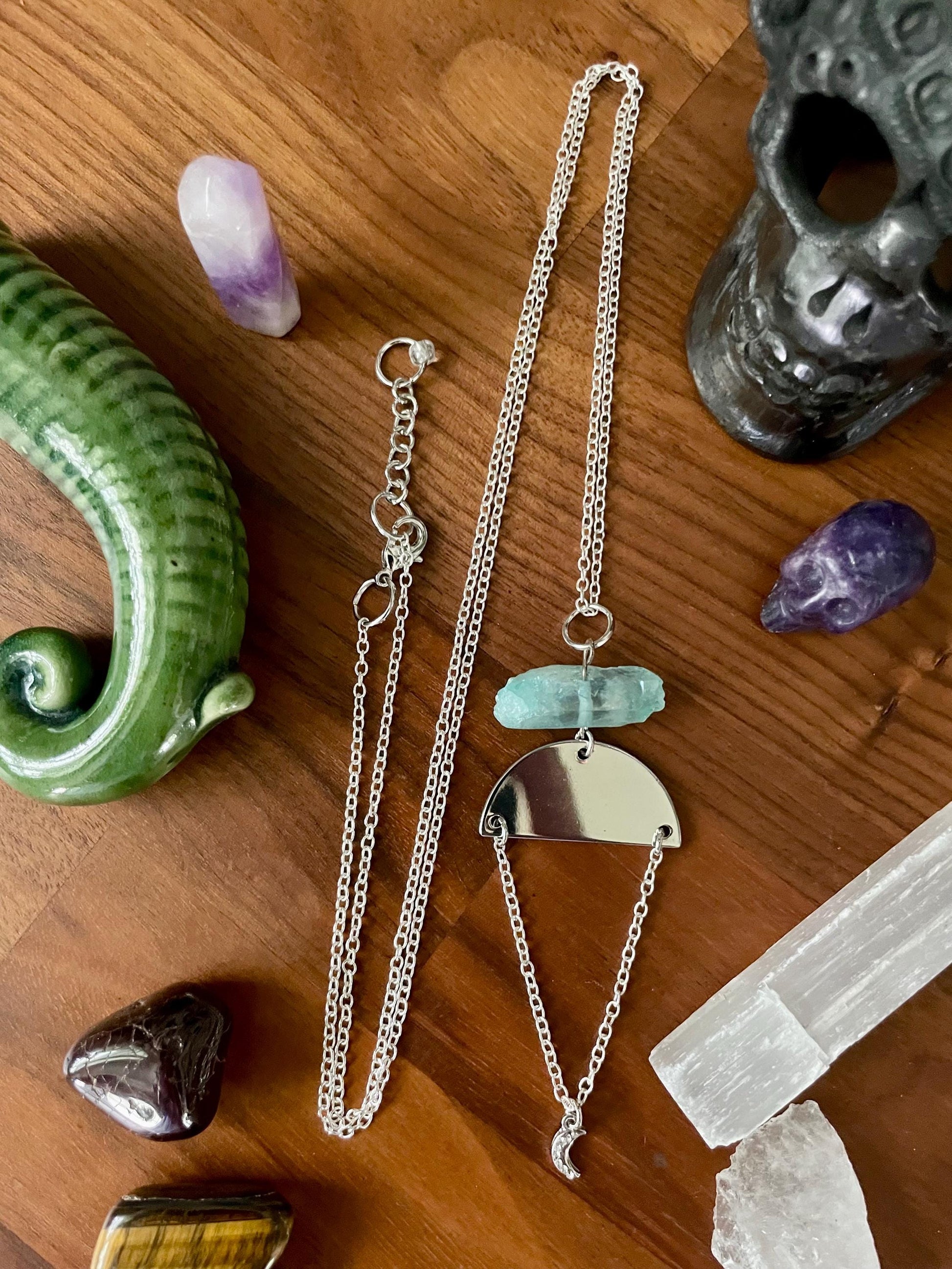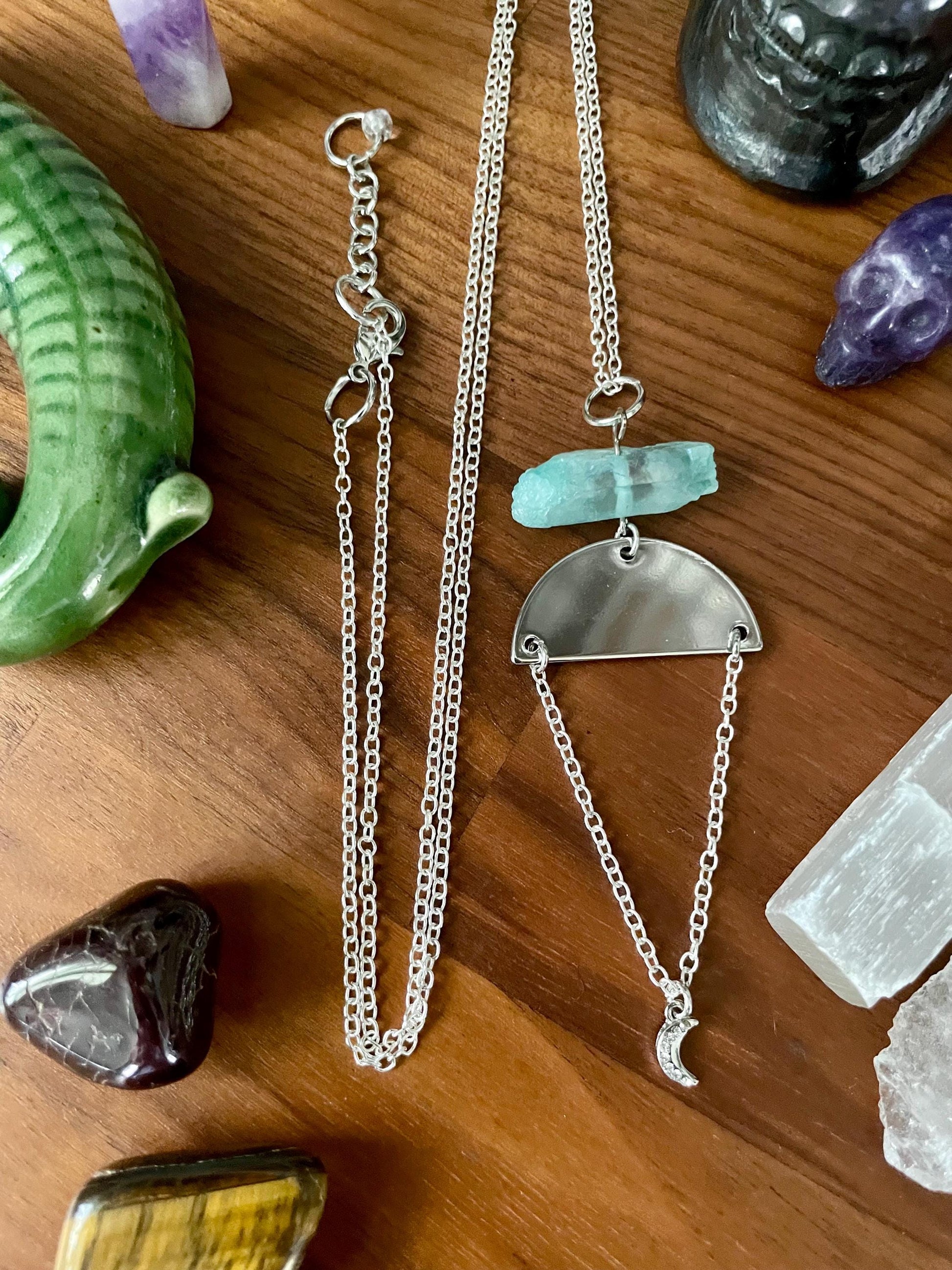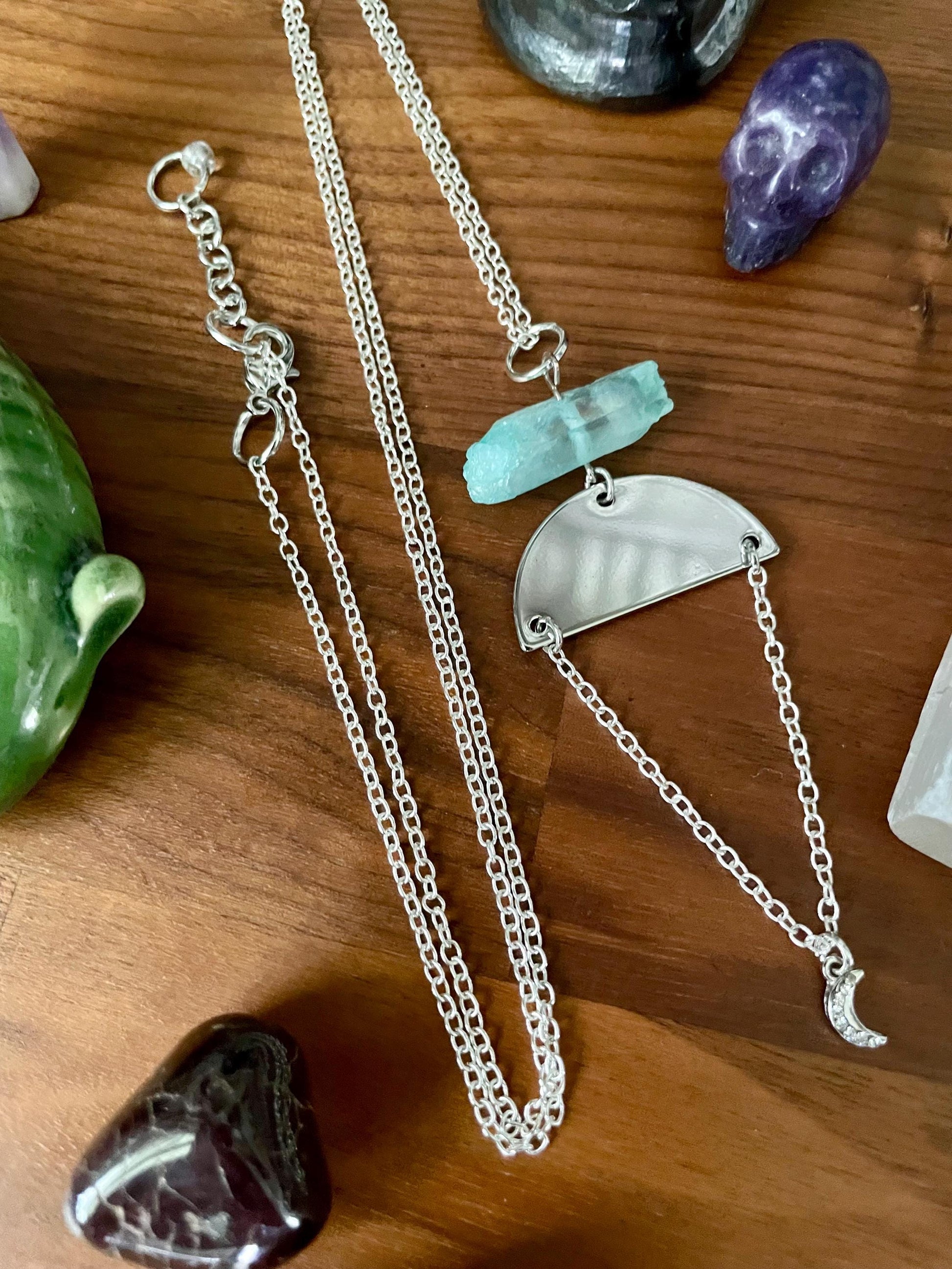 Aqua Quartz Crystal Silver Tone Moon Dangly Half Moon Statement Necklace | Halloween gifts | Nickel Free Hypoallergic chains