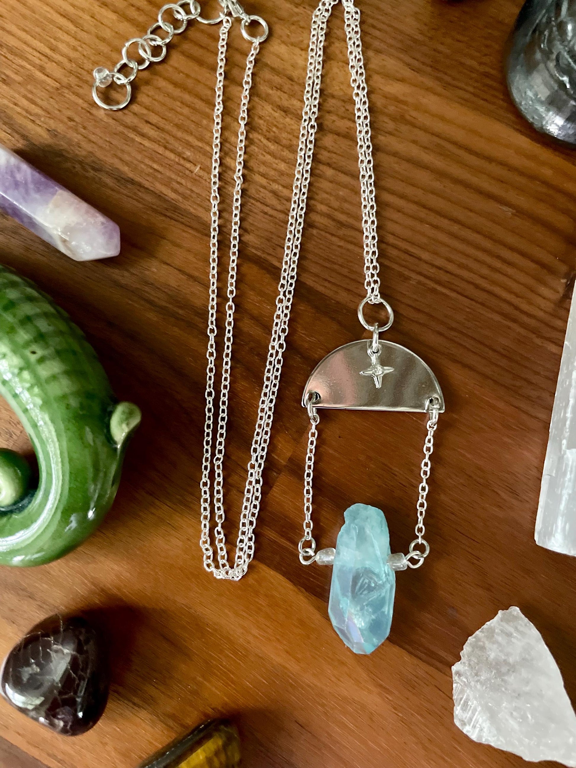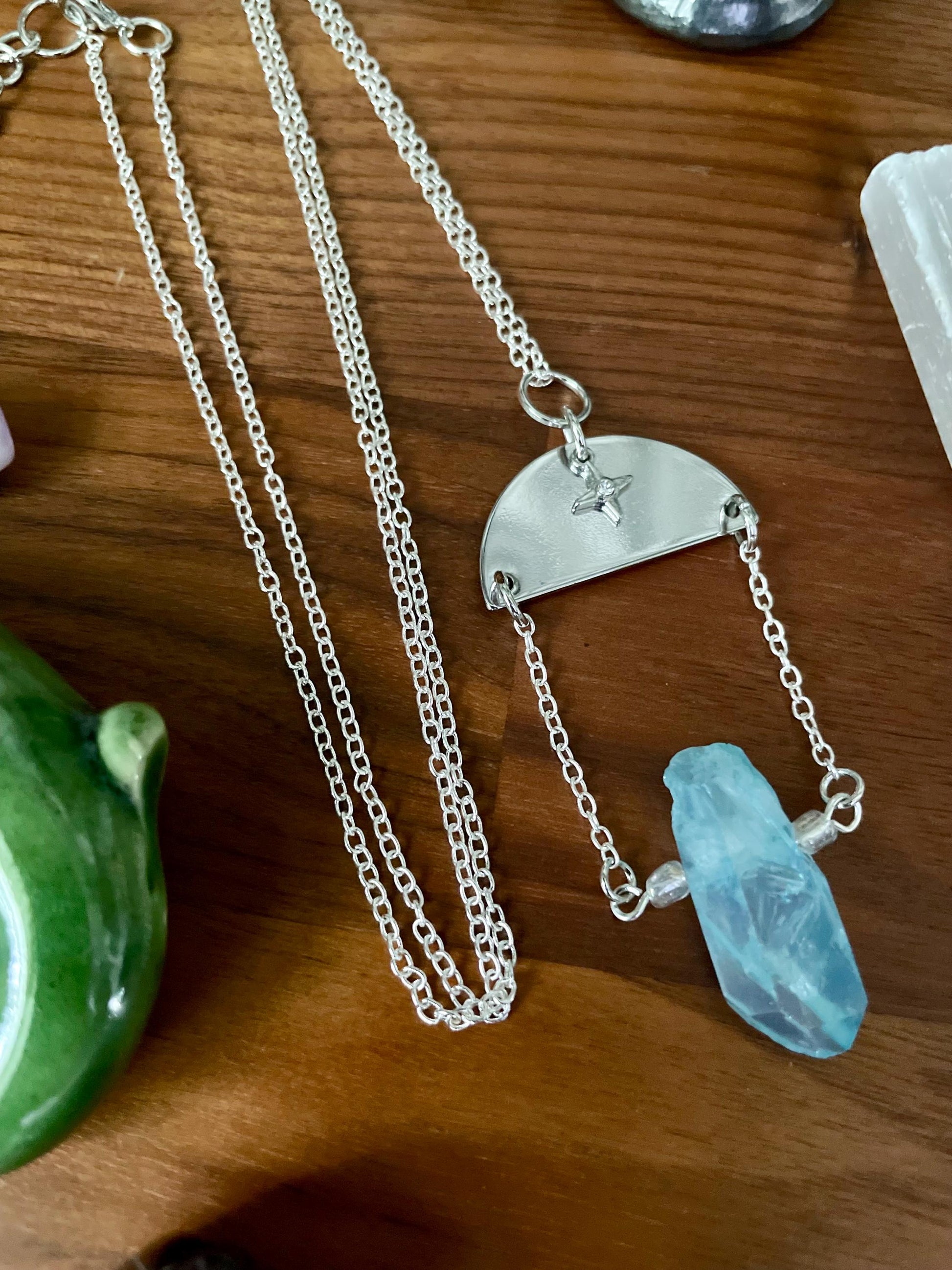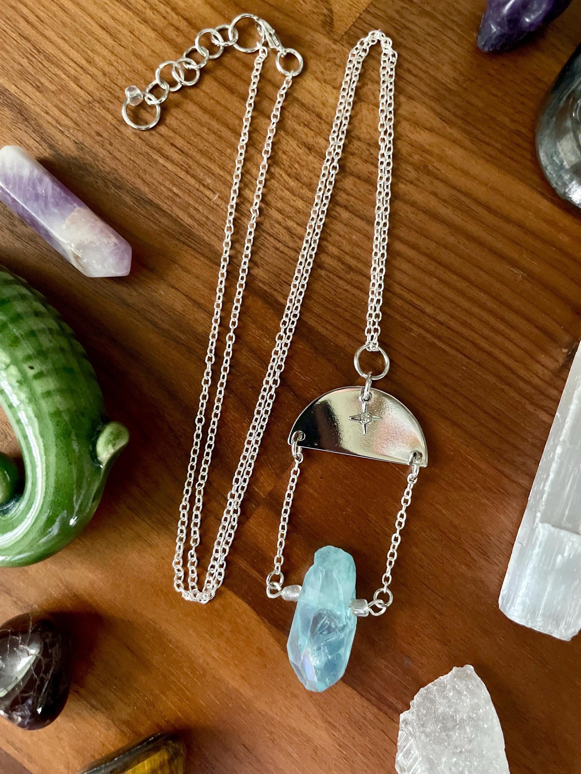 Aqua Quartz Crystal Silver Tone Twinkle Star Dangly Half Moon Statement Necklace | Halloween gifts | Nickel Free Hypoallergic