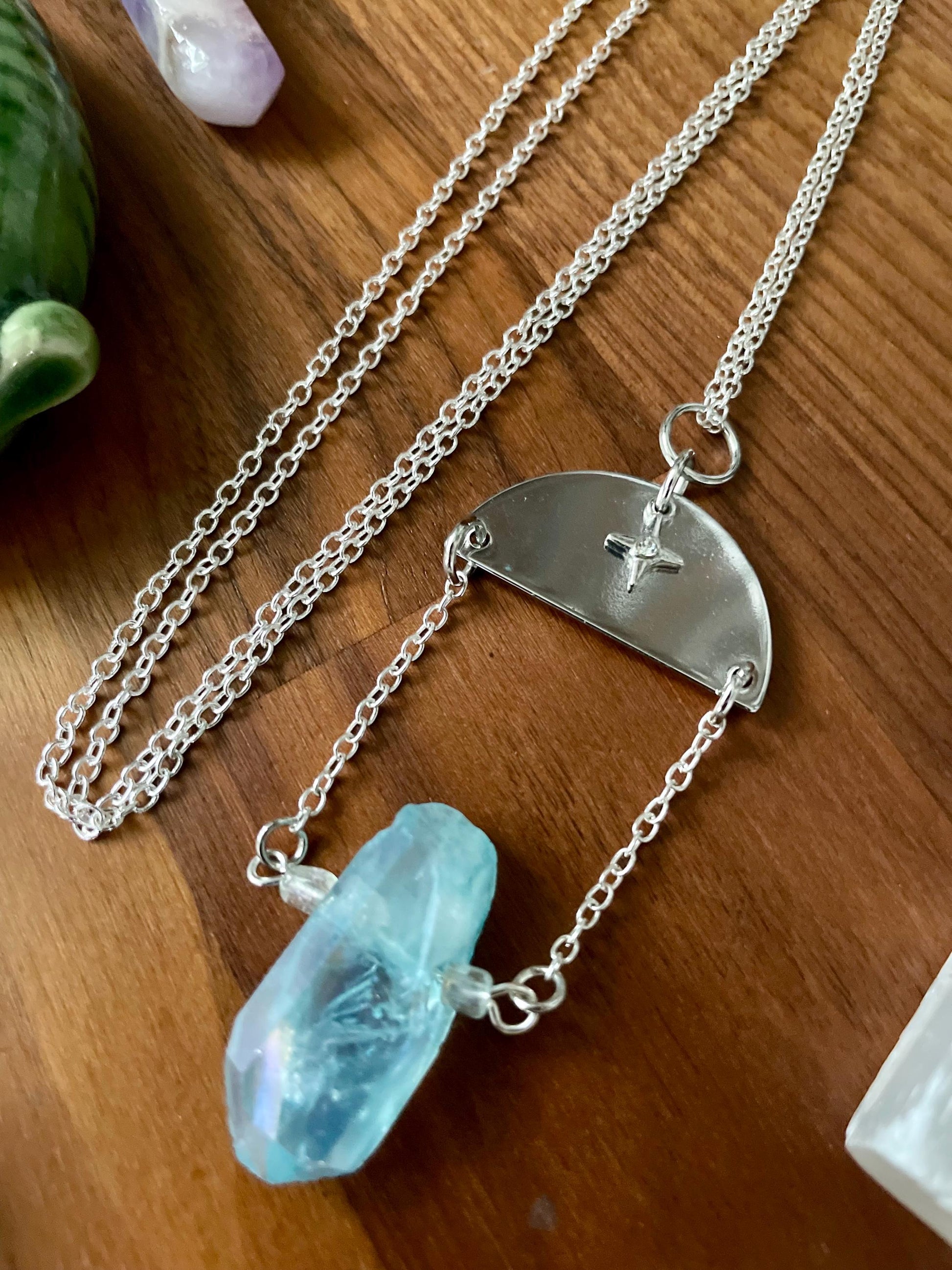 This Aqua Quartz Crystal Silver Tone Twinkle Star Dangly half circle Statement Necklace is created with nickel free silver tone chain. Aqua Quartz Crystal Silver Tone and Twinkle Star dangle from a silver half circle. The aqua quartz, silver chains, star charm and half circle pendants hang from silver tone nickel free chain. The total length of the necklace chain is 21" + a 1 1/2" extender to achieve the perfect length.