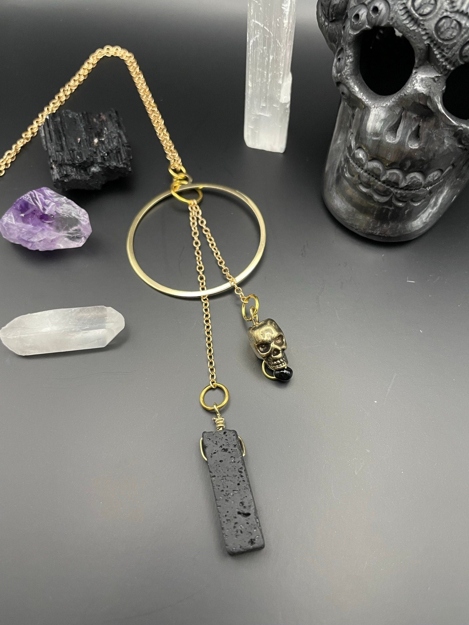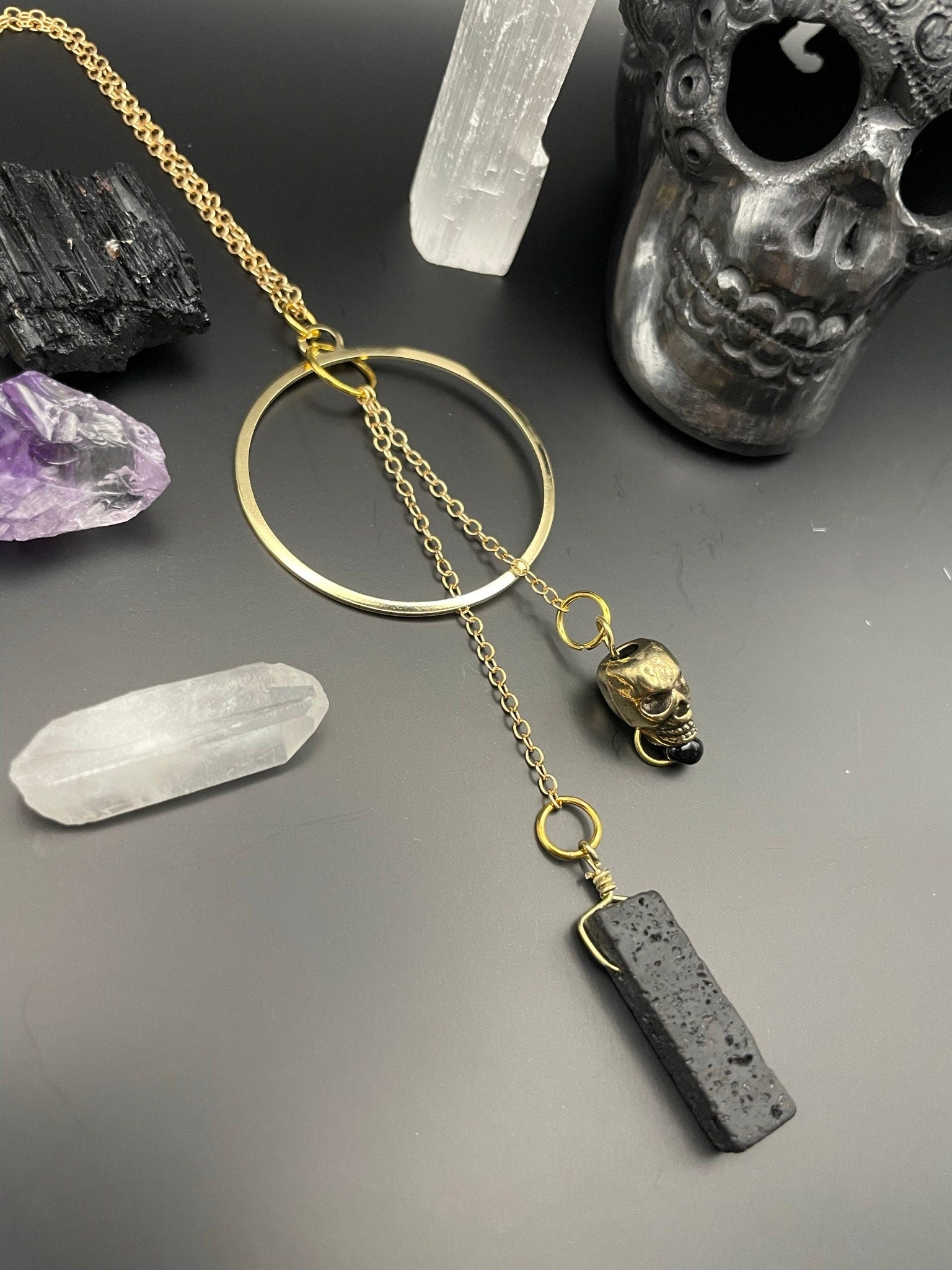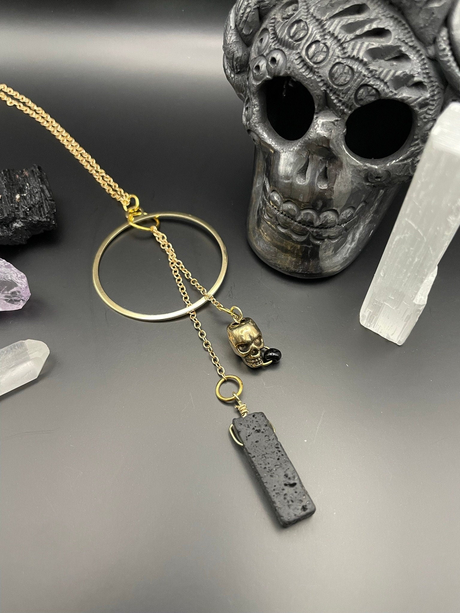 Black lava rock and golden skull statement necklace | Witchy necklace | Boho necklace | Nickel Free Hypoallergic chain