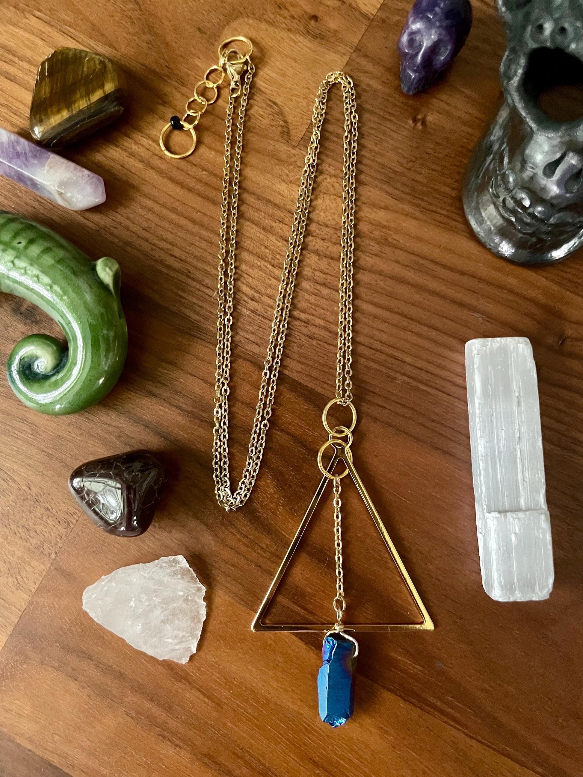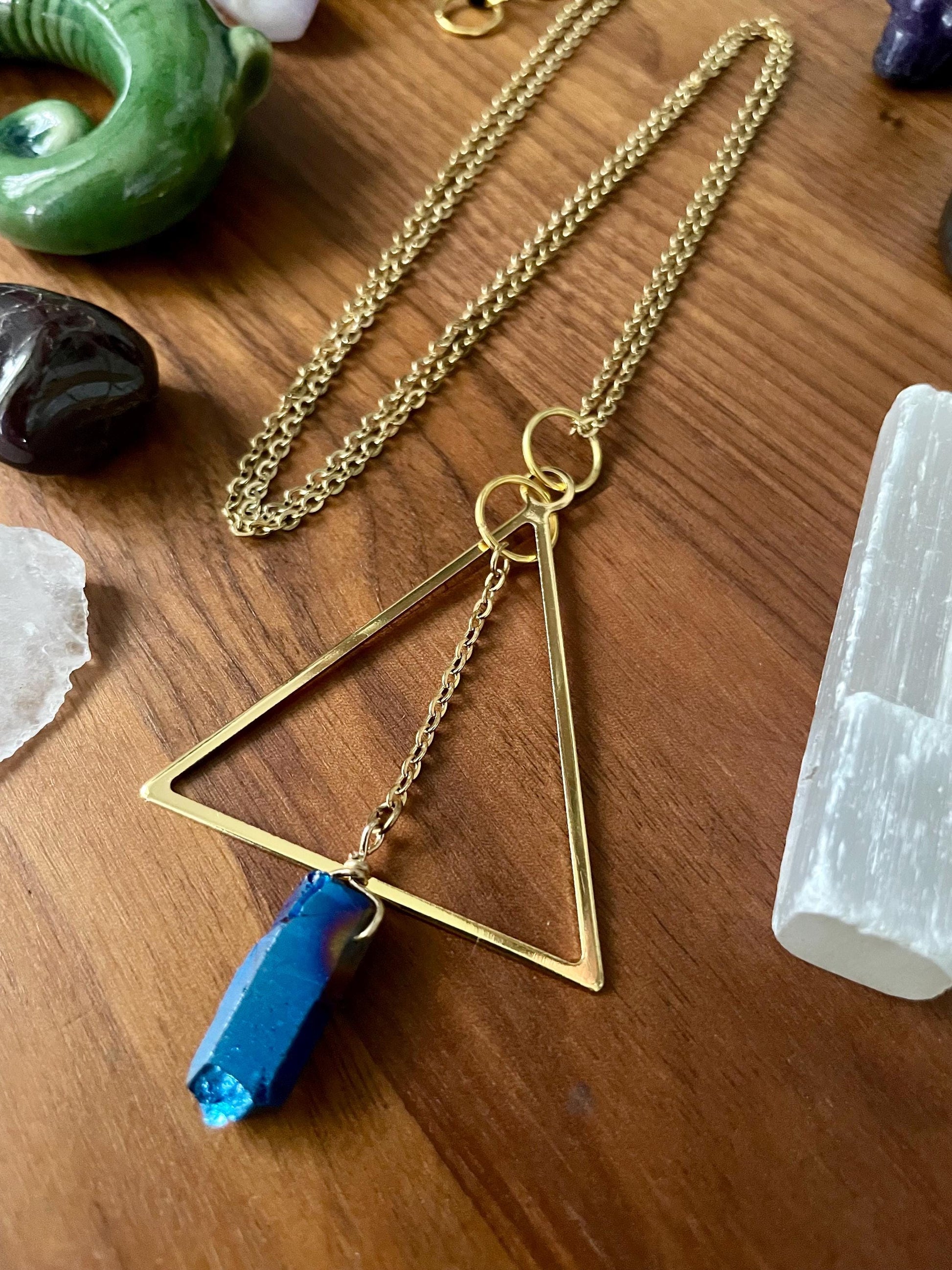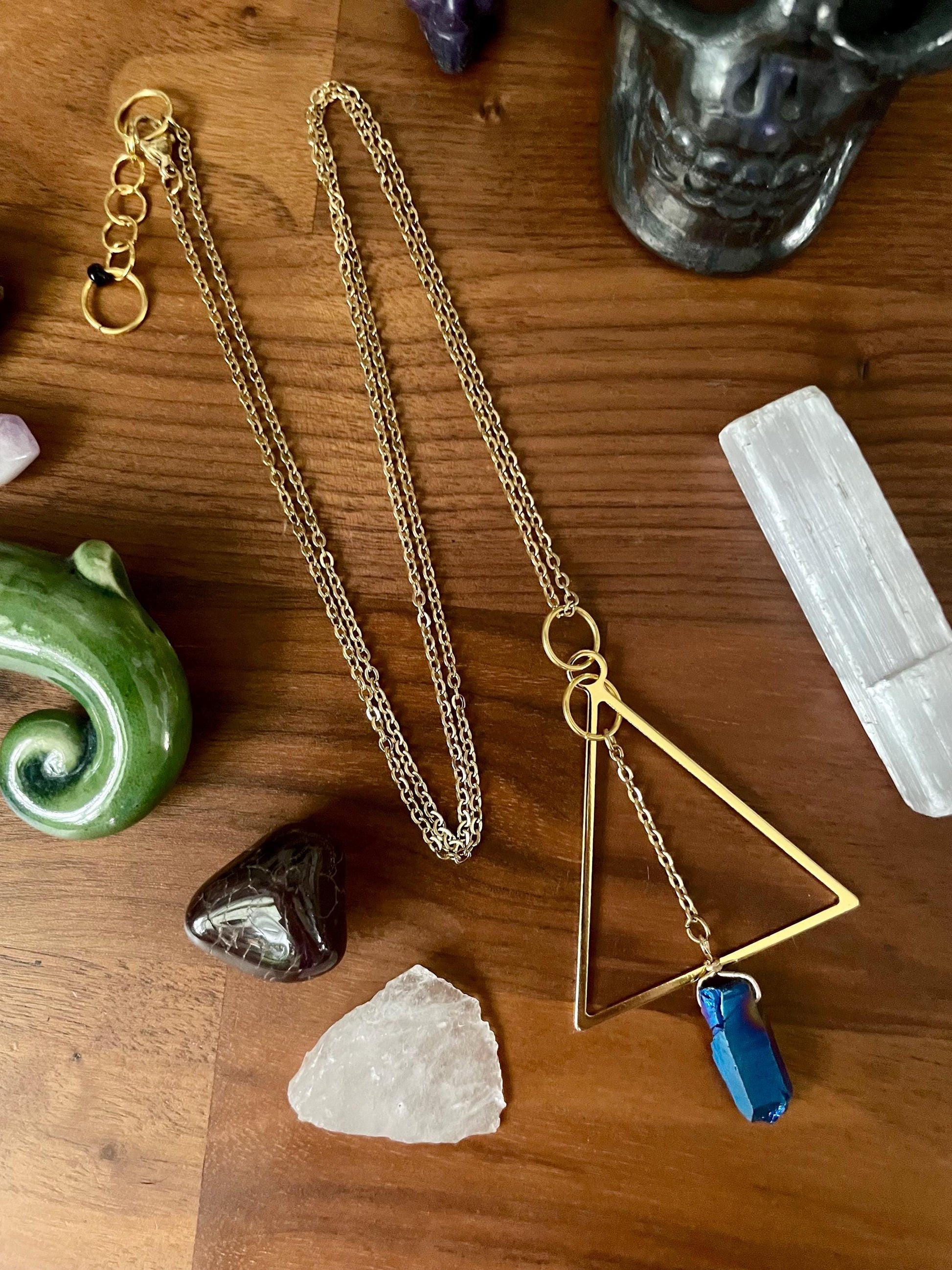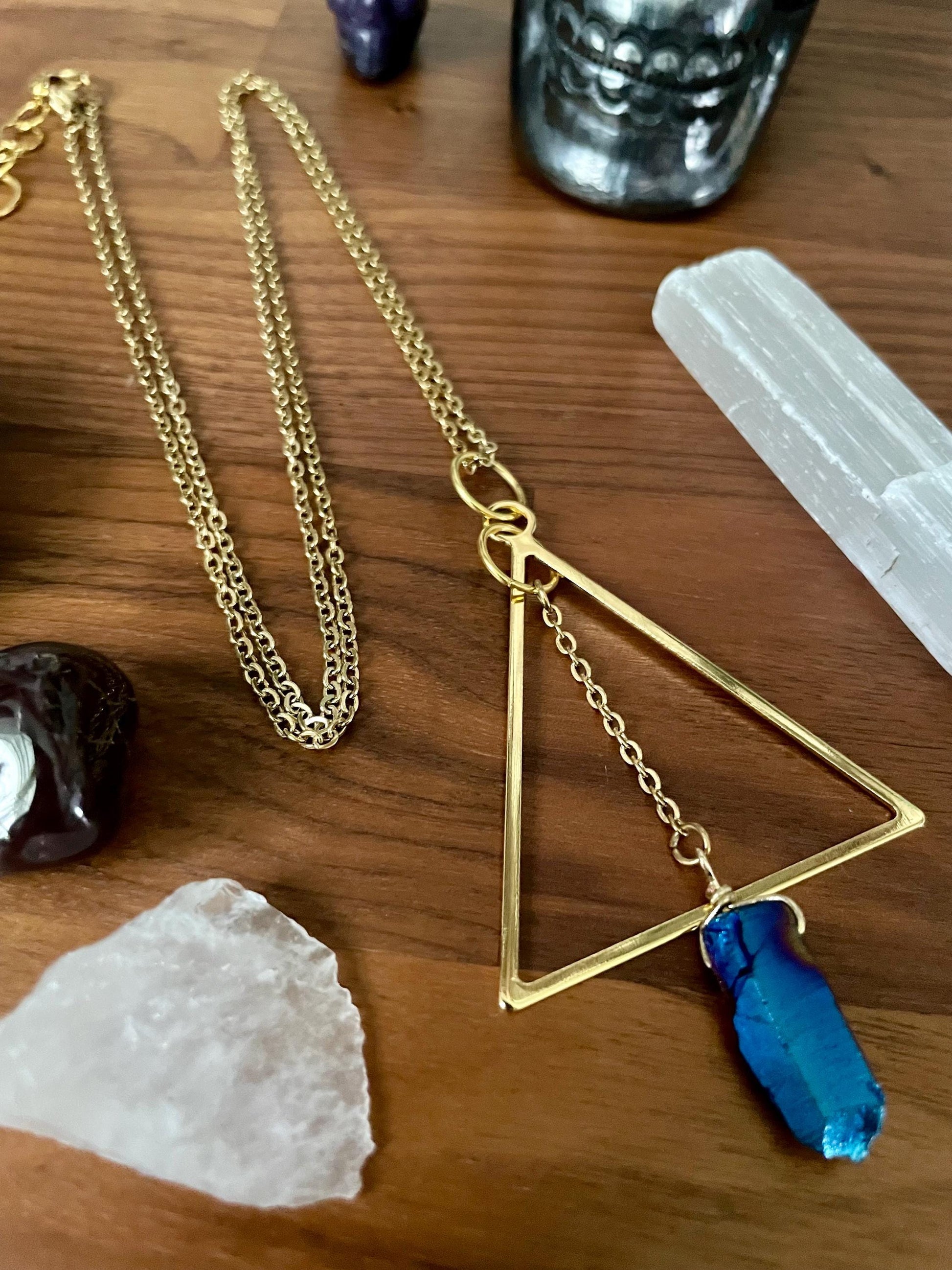 Celestial Sapphire Luster Quartz Gold Tone Triangle Pendant Statement Necklace | Nickel Free Hypoallergic chains | Witchy Boho Necklace