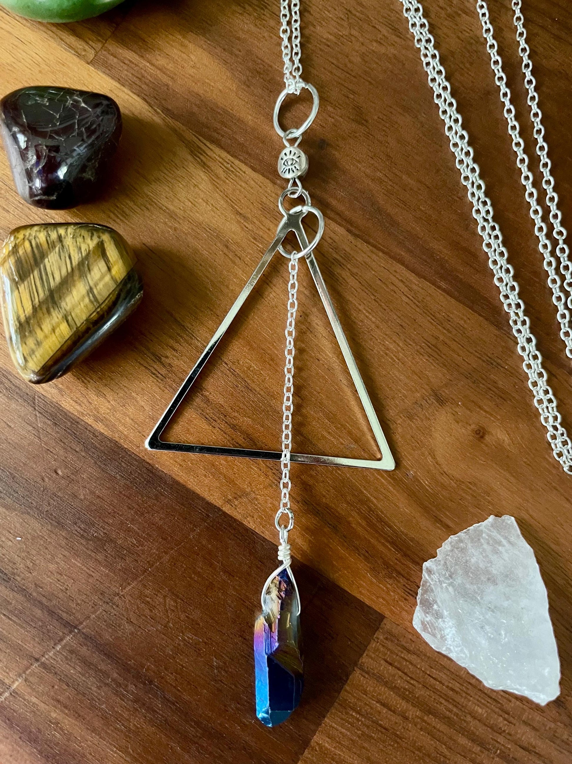 This Sapphire Luster Quartz Crystal and Mind's Eye Triangle dangly statement necklace is created with nickel free silver tone chain. Sapphire luster quartz and minds eye charm dangle from a silver triangle. The quartz, silver chains, minds eye beads and triangle pendants hang from silver tone nickel free chain. The total length of the necklace chain is 21" + a 1 1/2" extender to achieve the perfect length.