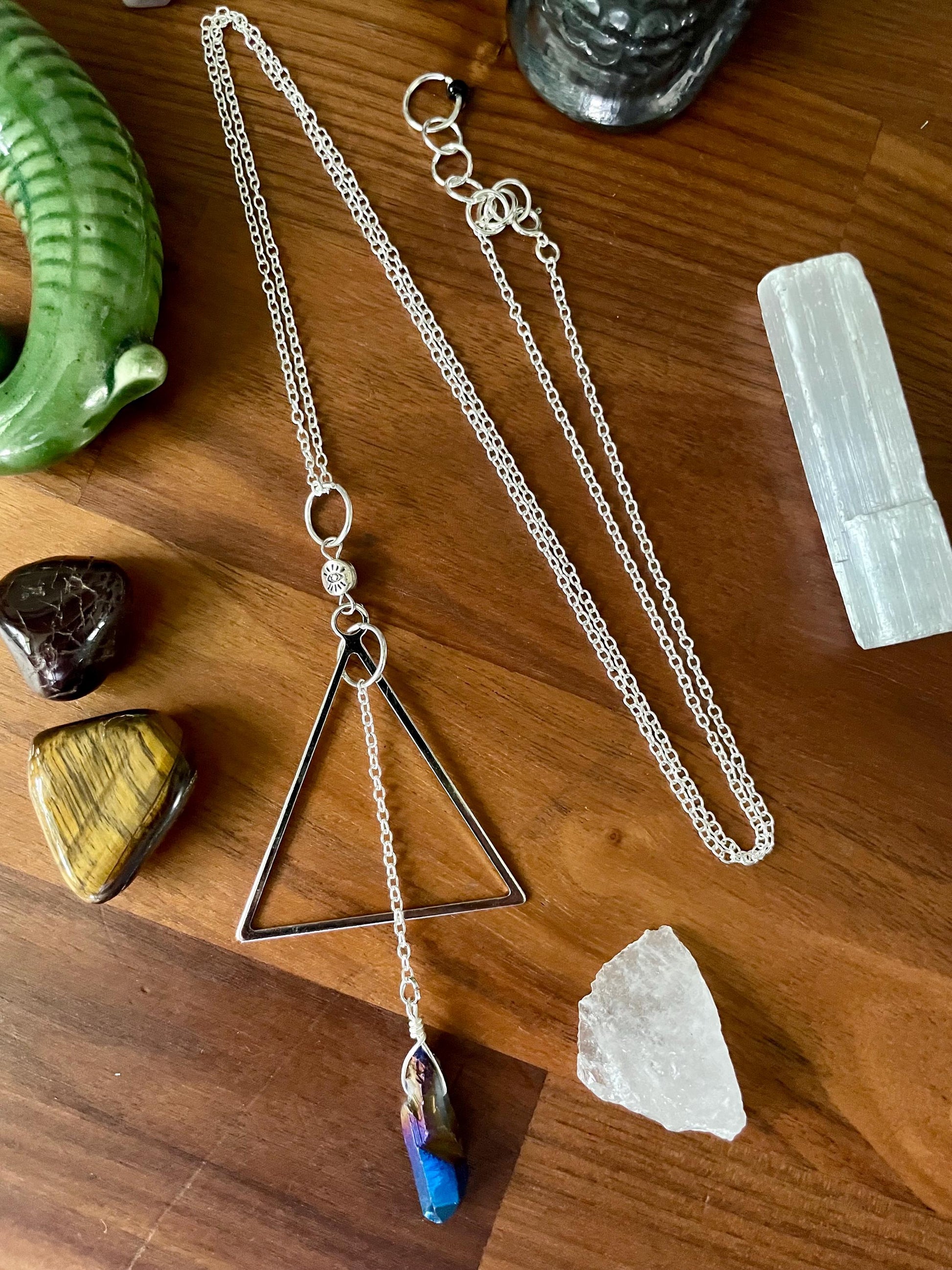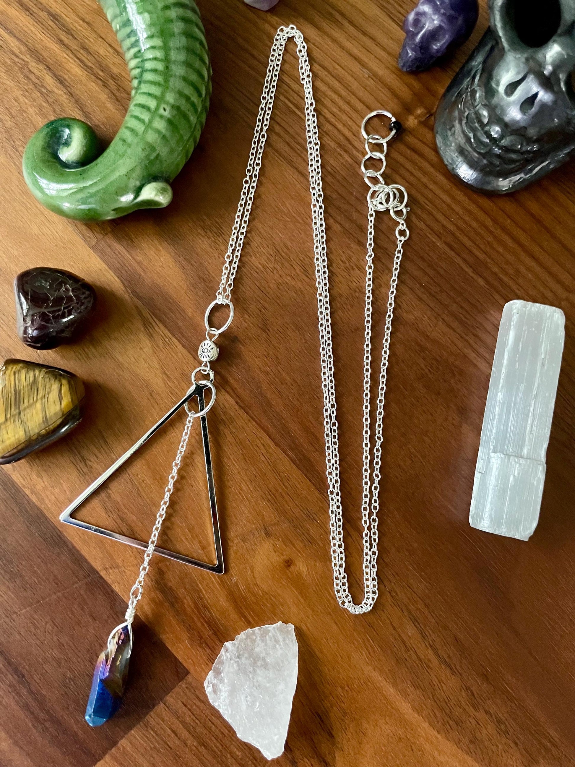 Celestial Sapphire Luster Quartz Mind's Eye Triangle dangle statement Necklace | Nickel Free Hypoallergic chains | Witchy Boho Necklace
