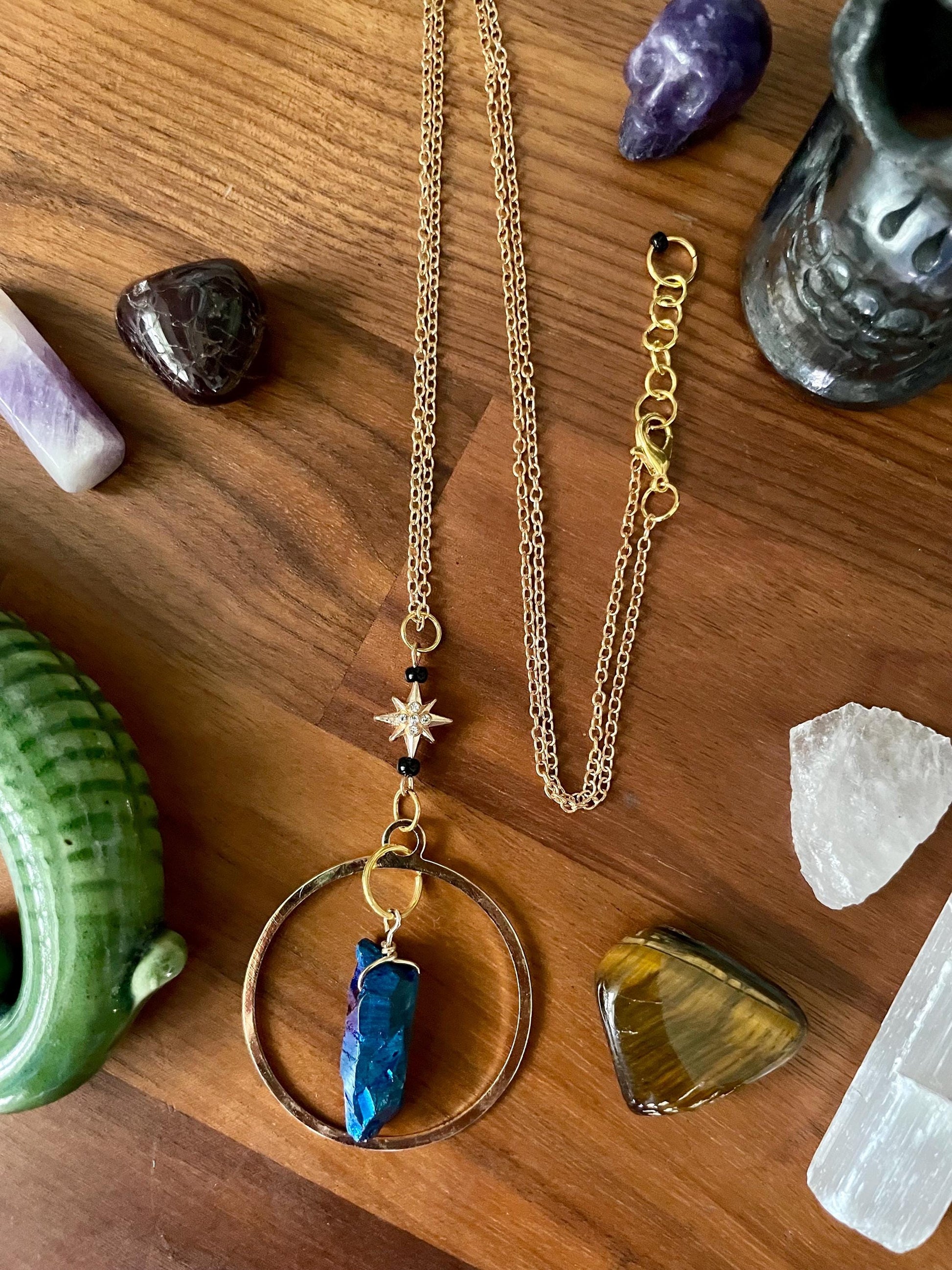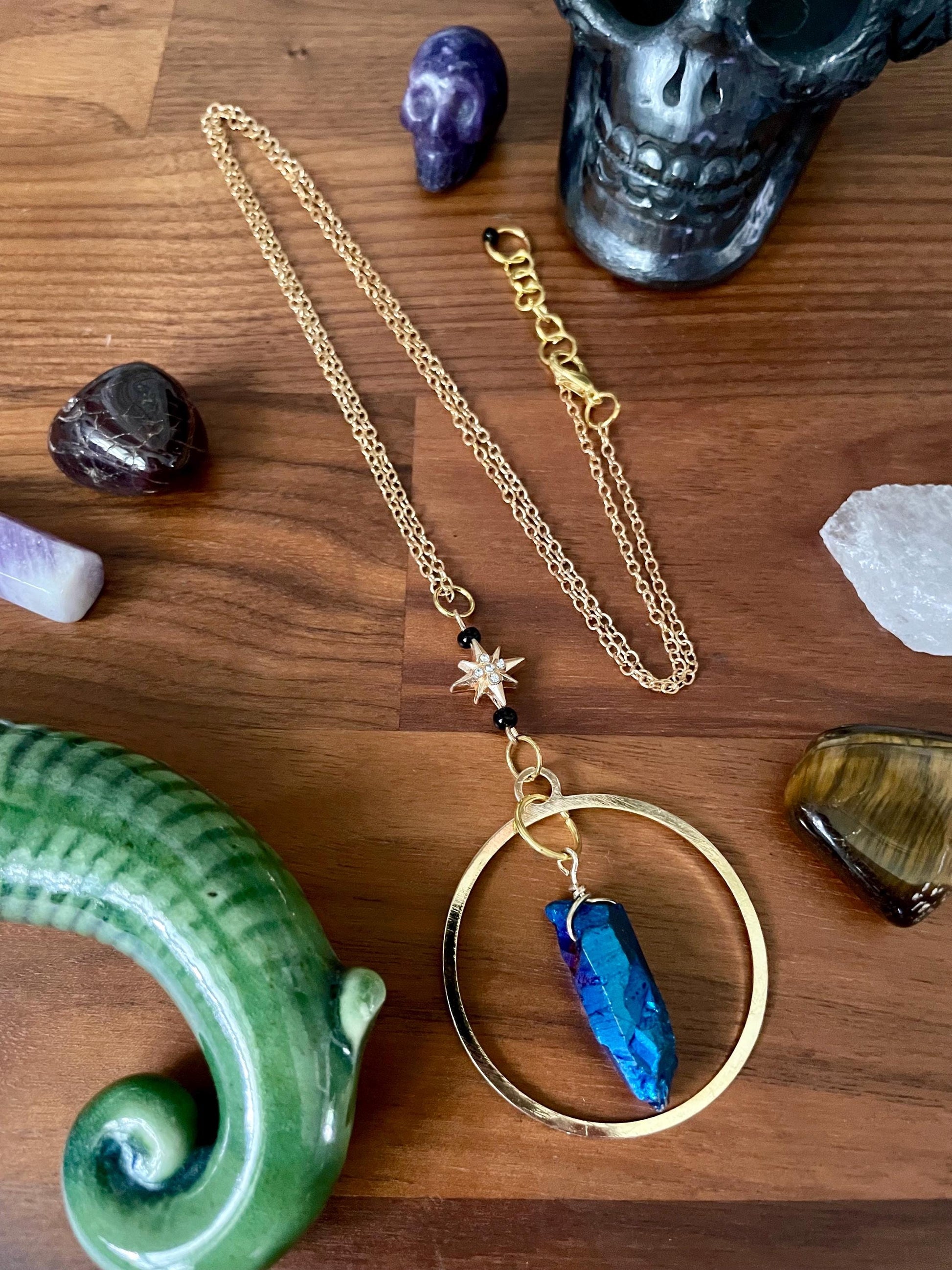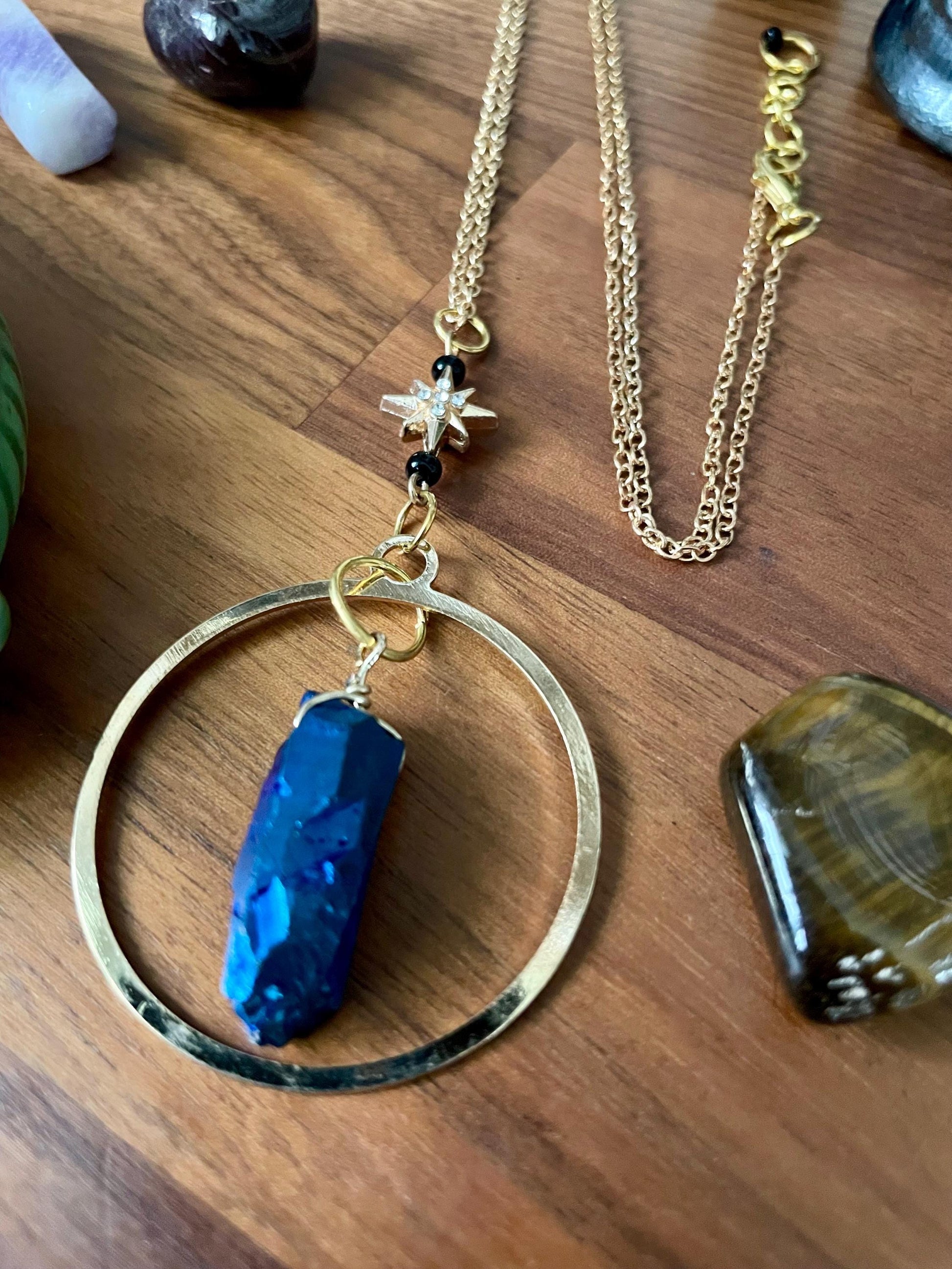 This Sapphire Luster Quartz Crystal and twinkly star dangly celestial statement necklace is created with nickel free gold tone chain. Sapphire luster quartz and twinkle star charm dangle from a gold circle. The quartz, gold chains, star beads and circle pendants hang from gold tone nickel free chain. The total length of the necklace chain is 21" + a 1 1/2" extender to achieve the perfect length.