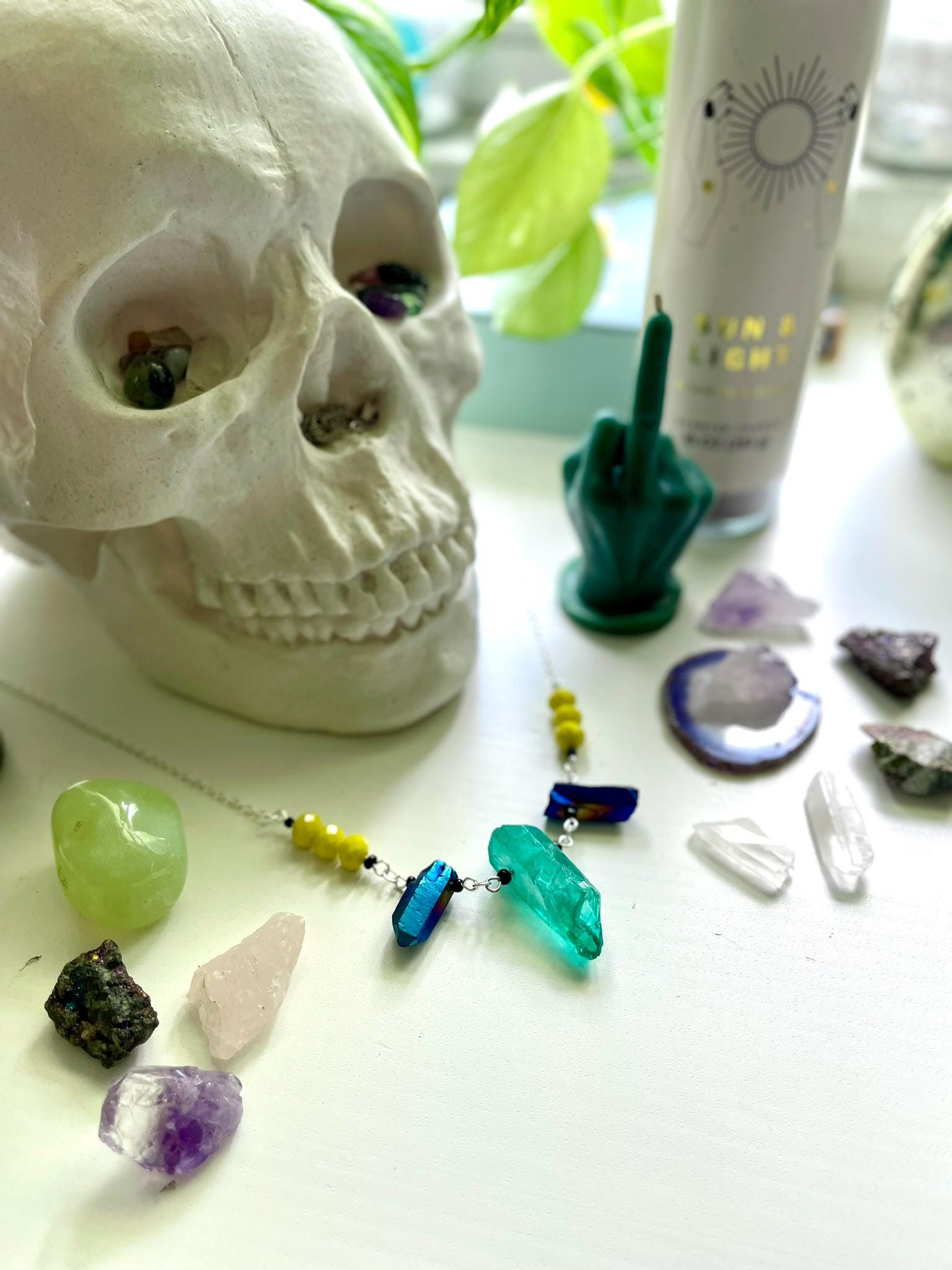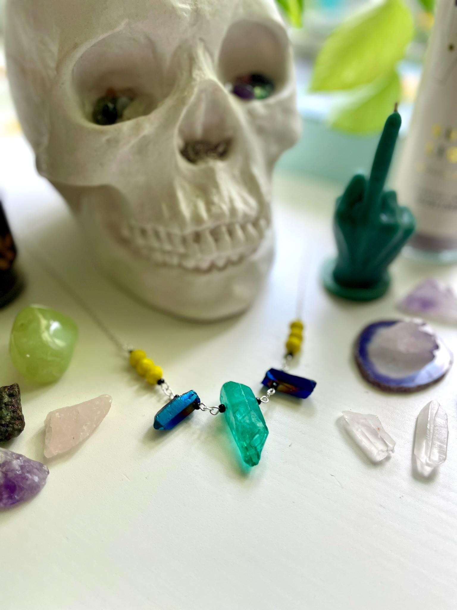 This quartz statement necklace is created with nickel free silver tone chain. One large green dyed quartz crystal hangs in between iridescent blue dyed quartz with 3 neon yellow faceted beads on each side. The total length of the necklace chain is 24” long with a 1” extender to get the perfect length.