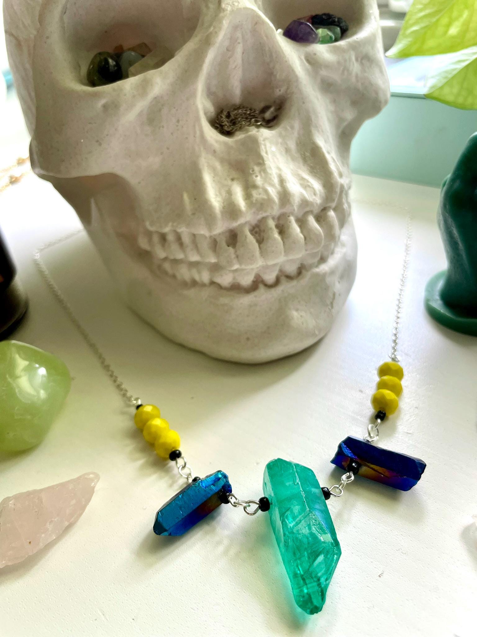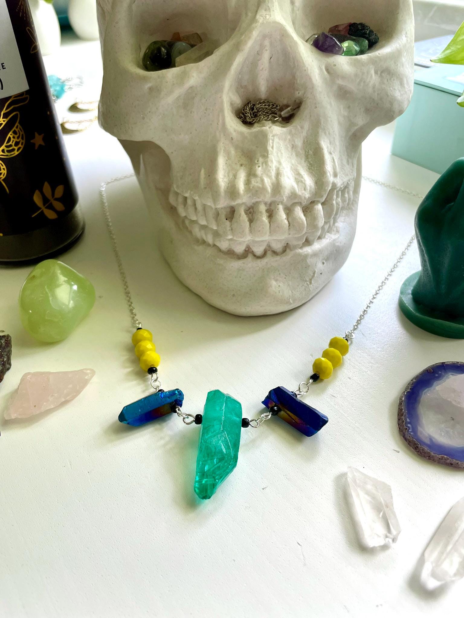 Handcrafted Quartz Crystal Statement Necklace with dyed green and blue quartz, yellow beads | Nickel Free Hypoallergic plated steel chain