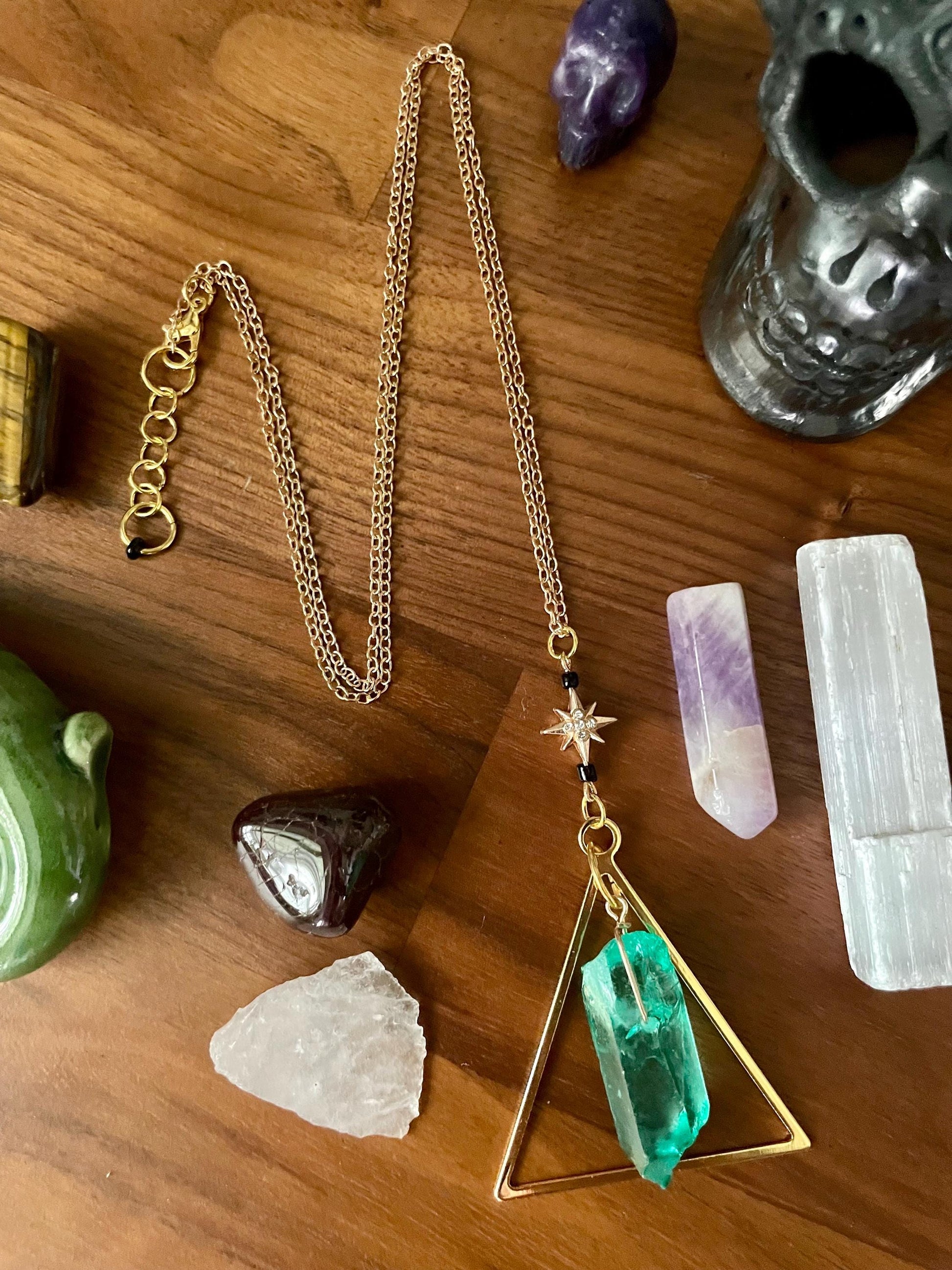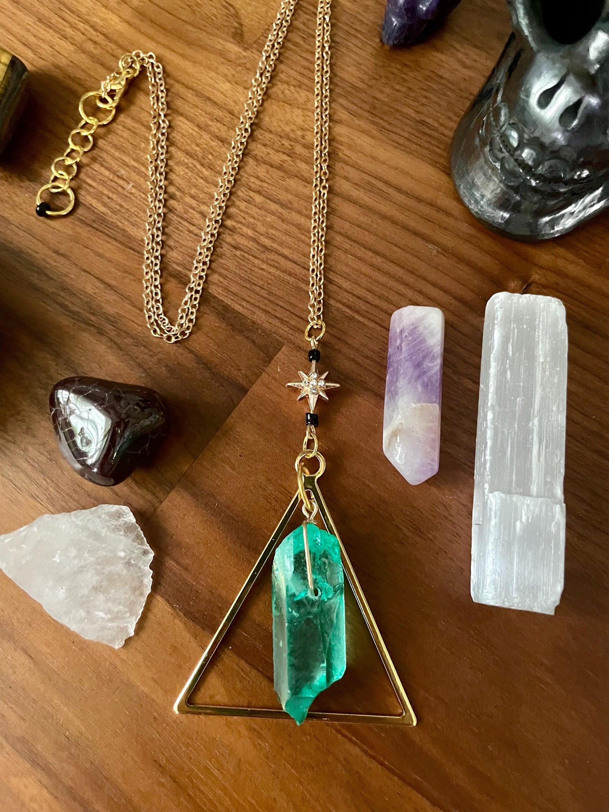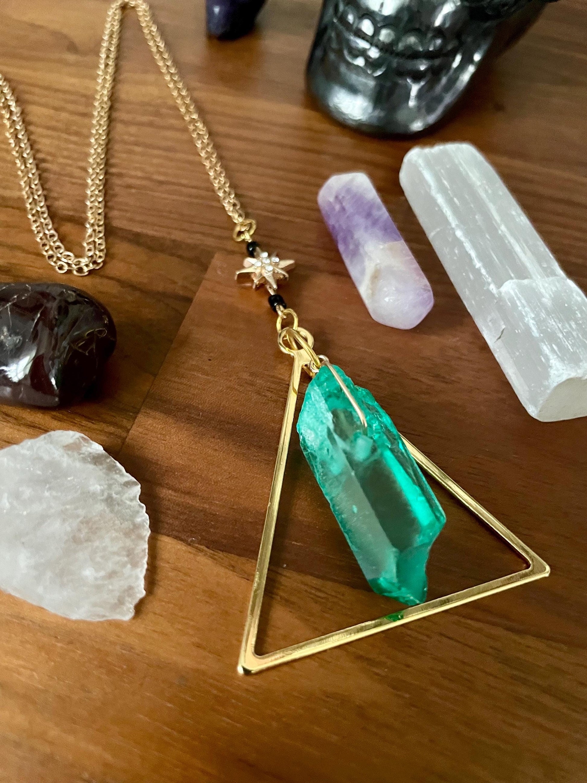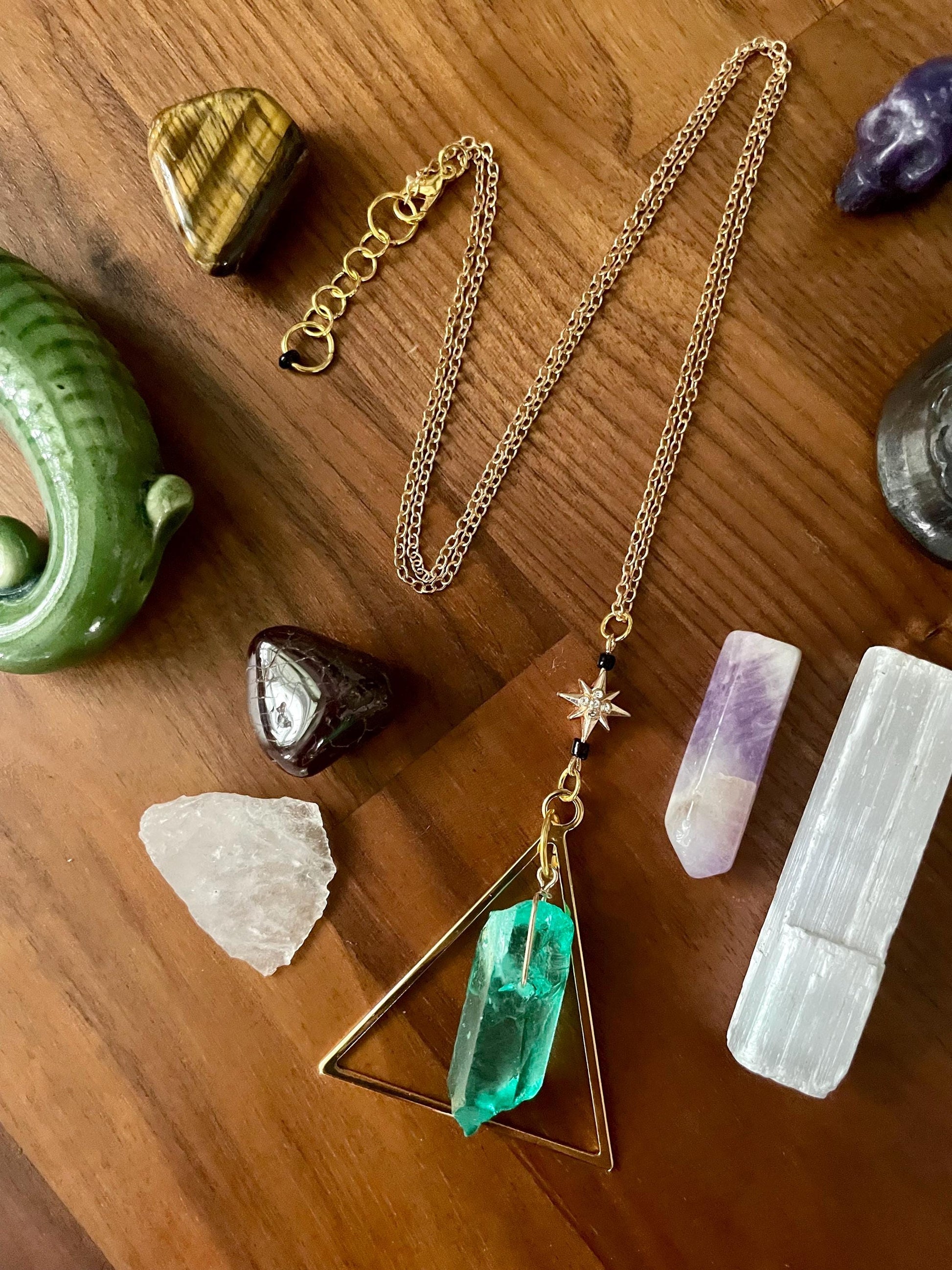 Handcrafted Sedona Quartz Crystal Triangle Statement Necklace with Gold Rhinestone Twinkle Star | Nickel Free Hypoallergic steel chain