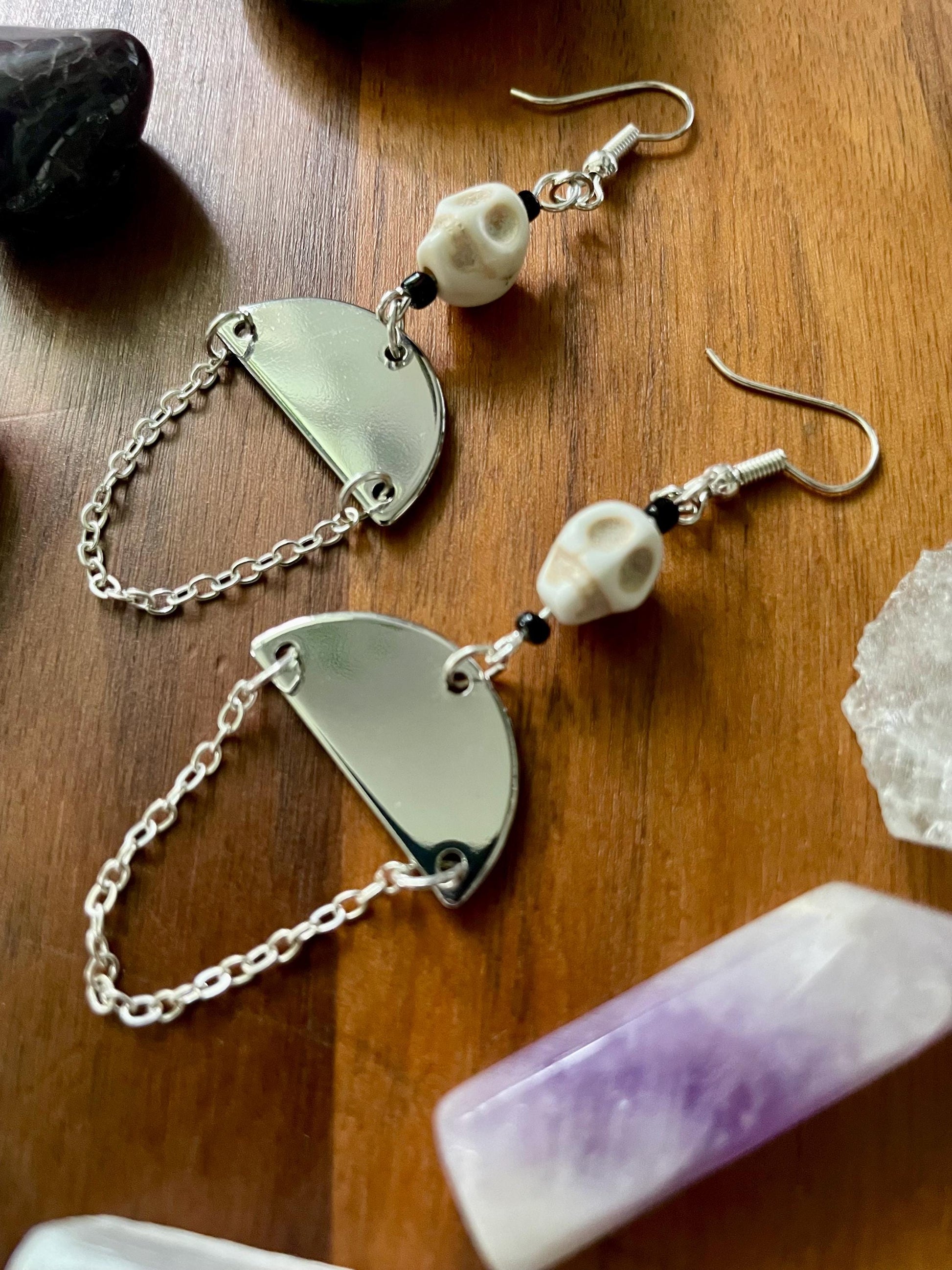 These white turquoise skull and semi-circle dangly earrings are created with nickel free silver tone ear wires. A skull charm and silver half circle plates dangle with silver chains. The skull charm, silver chains, and half circle pendants hang from silver tone nickel free ear wires. The total length of the earrings from the top of the ear wire to the bottom of the chainmail is 3 1/4” long and about 1" wide.
