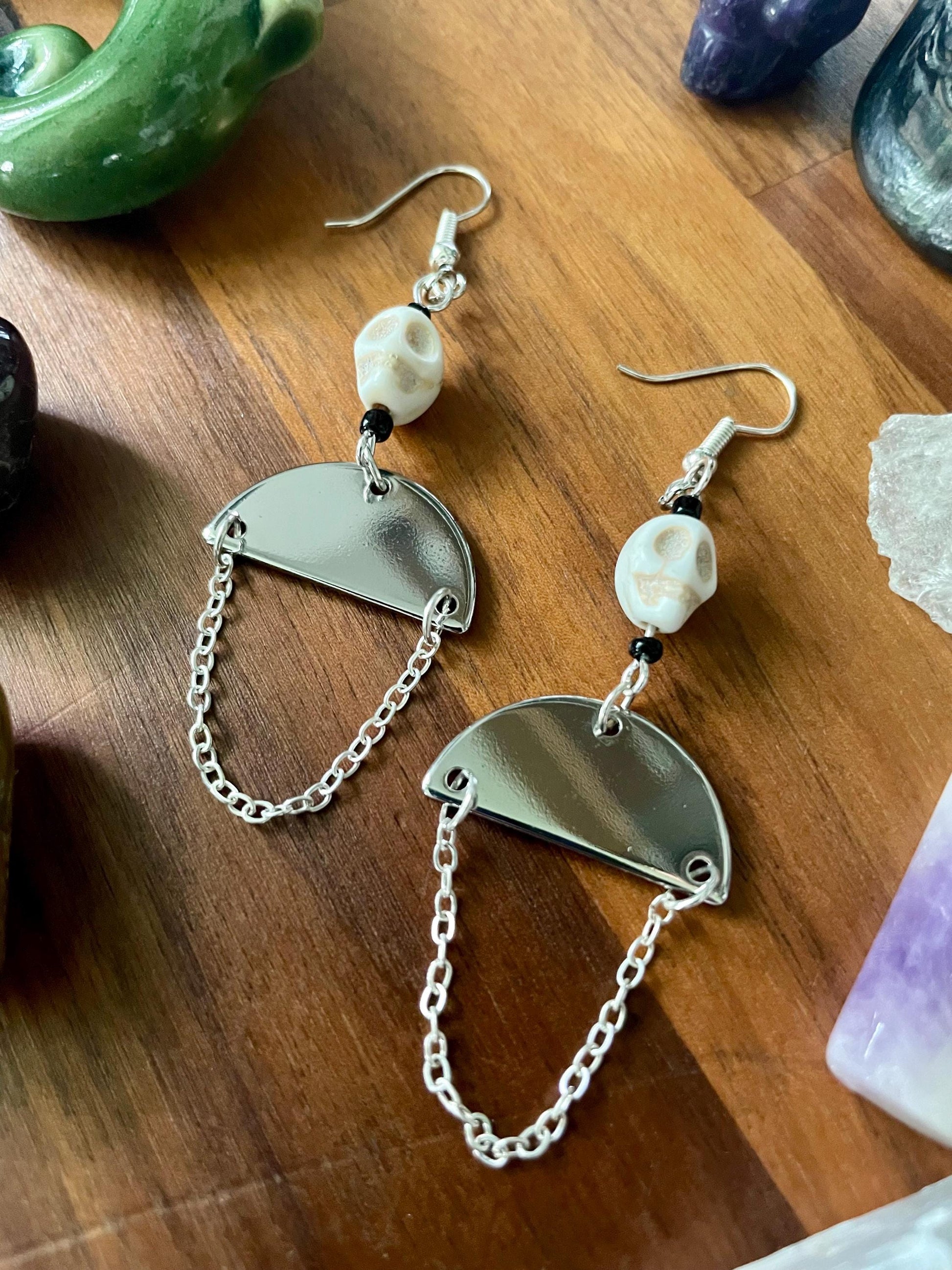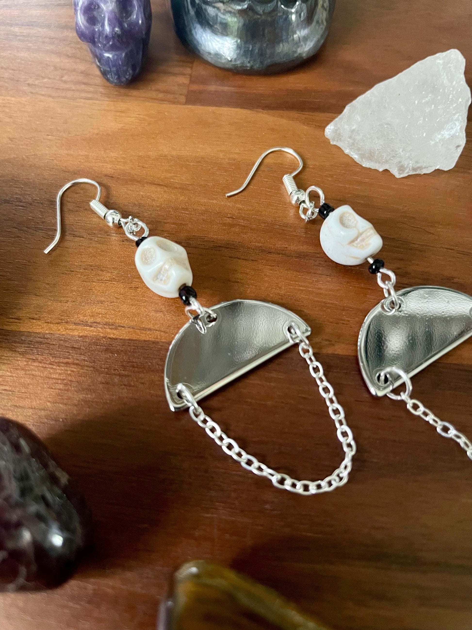 Skull silver half moon dangle earrings | Witchy Boho dangly drop Statement Earrings | Nickel Free Hypoallergic plated steel ear wires